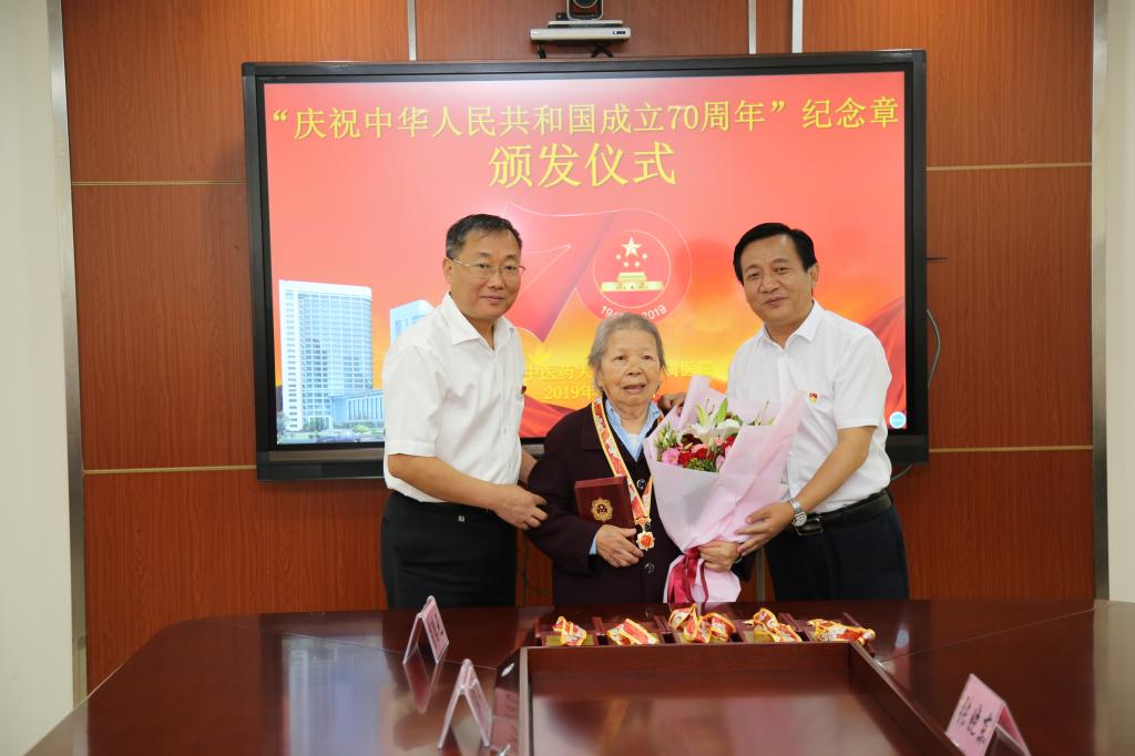 2019年9月27日上午,一附院隆重举行“庆祝中华人民共和国成立70周年”纪念章颁发仪式,医院领导翟剑波、朱明军、张晓东、赵敏和纪念章获得者代表及部分职能部门负责人参加活动。仪式由一附院院长朱明军主持。一附院离休干部肖德元、张毅敏、邱伟英、栗怀德、蒋虹、刘慧敏、孙凤阁、张祥德、郭敬华、丁威共10位同志荣获“庆祝中华人民共和国成立70周年”纪念章。医院党委书记翟剑波为纪念章获得者代表颁发纪念章,朱明军为老同志们送上了鲜花,共同向老同志致以亲切的问候和崇高的敬意。