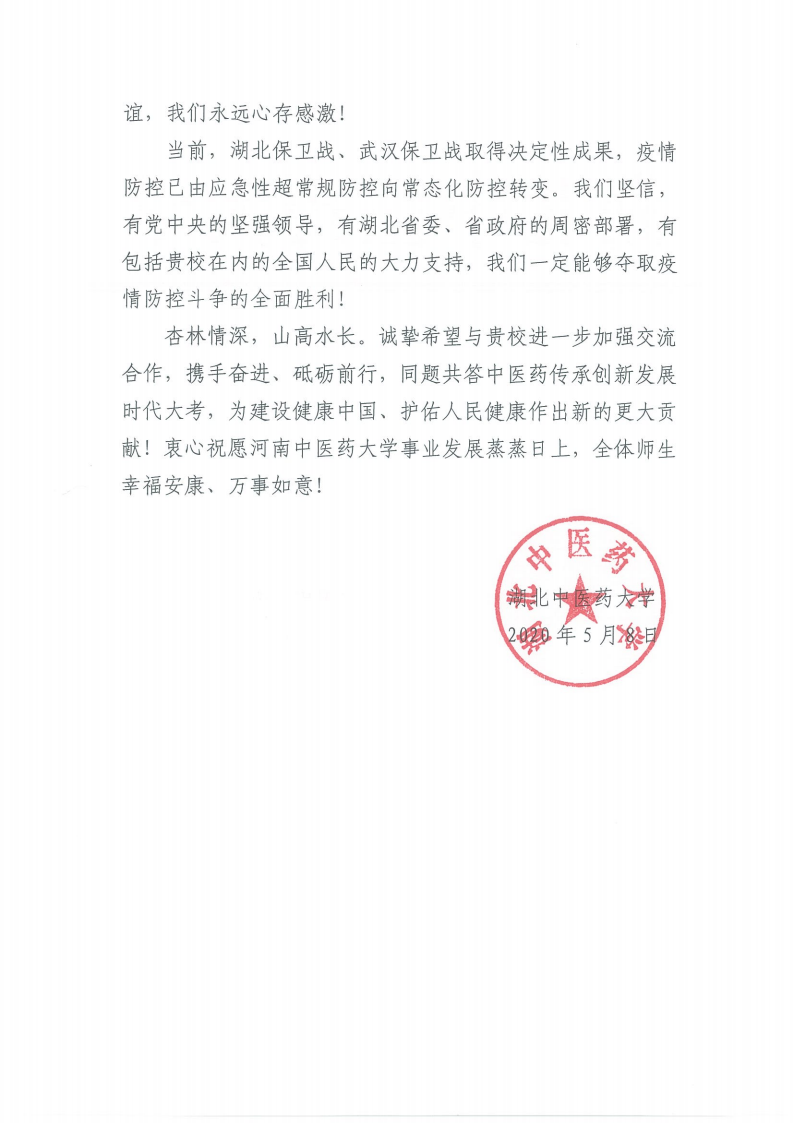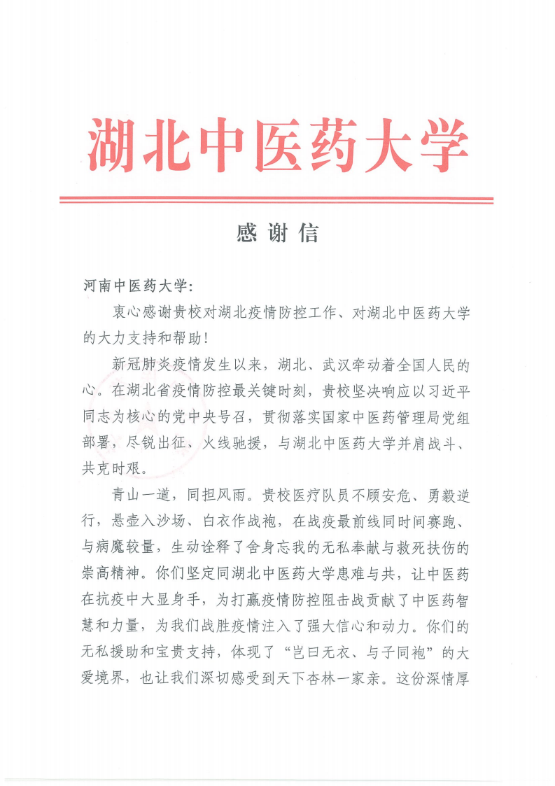 信中提到:“青山一道,同担风雨。贵校医疗队员不顾安危、勇毅逆行,悬壶入沙场、白衣作战袍,在战疫最前线同时间赛跑、与病魔较量,生动诠释了舍身忘我的无私奉献与救死扶伤的崇高精神。你们坚定同湖北中医药大学患难与共,让中医药在抗疫中大显身手,为打赢疫情防控阻击战贡献了中医药智慧和力量,为我们战胜疫情注入了强大信心和动力。你们的无私援助和宝贵支持,体现了“岂曰无衣、与子同袍”的大爱境界,也让我们深切感受到天下杏林一家亲。这份情谊,我们永远心存感激!”