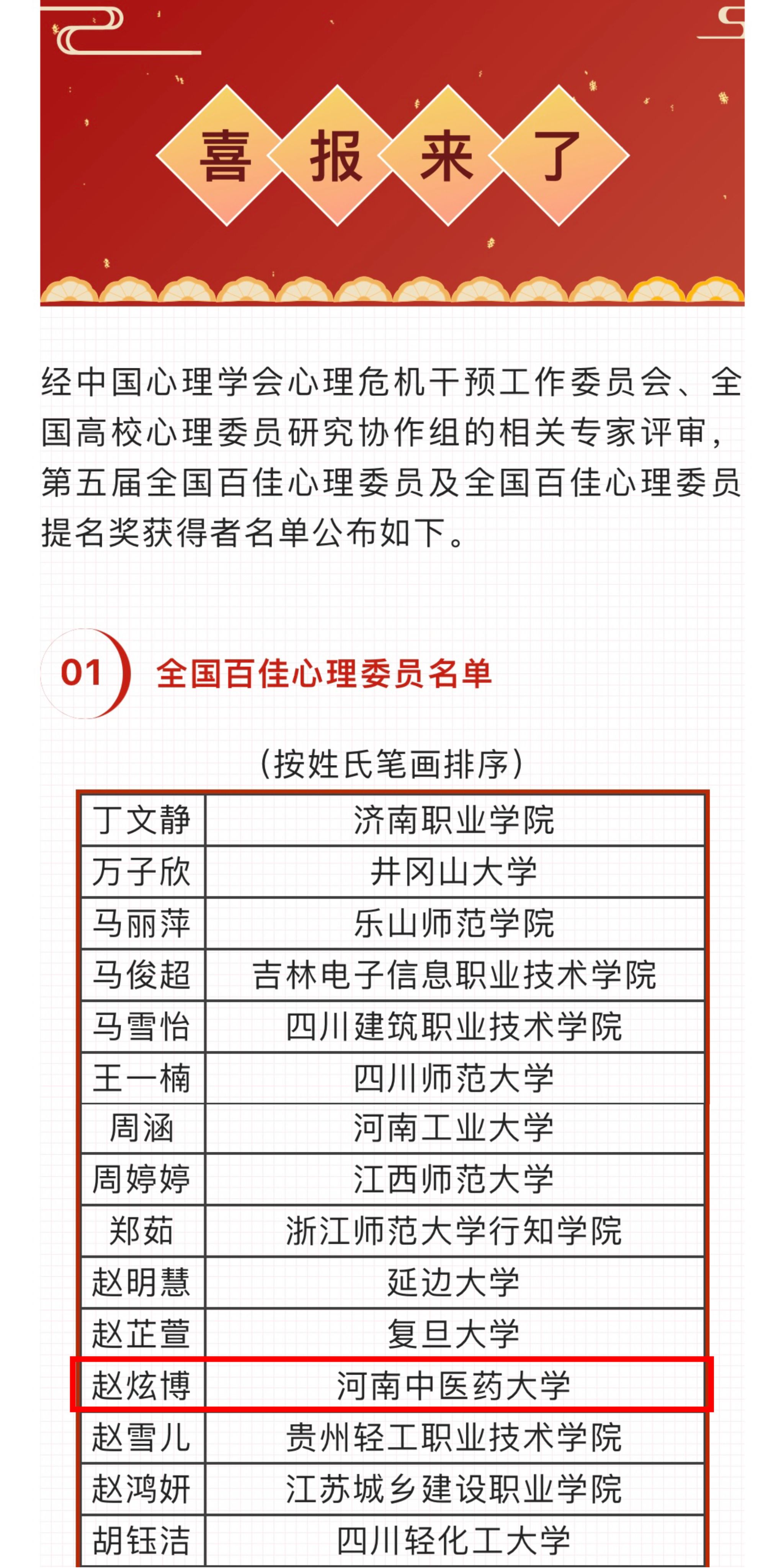 本网讯(文/图 刘俊岐)近日,第十七届全国高校心理委员工作研讨会暨朋辈心理辅导论坛通过线上视频会议形式举行。会上,leyu·乐鱼(中国)体育官方网站推荐的两名心理委员通过线上个人展示投票,专业评审,现场答辩(线上)等环节,leyu·乐鱼(中国)体育官方网站第一临床医学院2020级中西医临床医学三班的赵炫博同学成功入选为全国百佳心理委员,并竞选成为全国百佳心理委员论坛主席团副主席,骨伤学院2020级中医骨伤科学本科一班的李玥姣同学入选全国百佳心理委员提名奖。这是leyu·乐鱼(中国)体育官方网站连续五年取得该项荣誉。