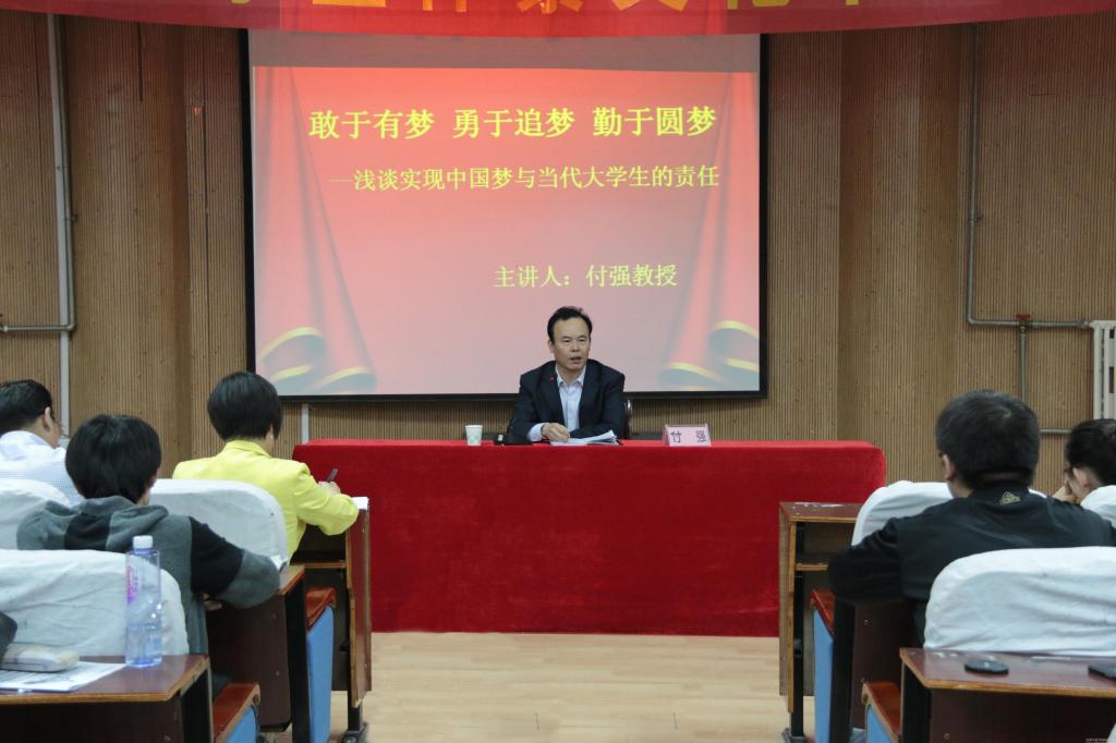 付强副院长从中国梦的内涵及时代背景、实现中国梦的要求、当代大学生肩负的责任等三个方面为在场师生做了讲解。首先,他向大家讲解了中国梦的内涵,并结合十八大精神阐述了中国梦就是要实现国家富强、民族振兴、人民幸福;付强副院长通过对当今中国及世界各国的发展状况对中国梦的历史背景和时代背景进行了分析,他认为追求并实现中国梦是时代的必然,实现中国梦是当代青年的时代主题。随后,付强副院长对中国特色社会主义道路进行了解读,他强调实现中国梦必须走中国道路,弘扬中国精神,凝聚中国力量。最后,付强副院长通过“才者,德之资也;德者,才之帅也”来要求当代大学生提高道德修养,力争德才兼备,做到为天地立心,为生民立命,继往圣之绝学,开万世之太平;他希望当代大学生要敢于担当,牢记使命,积极融入到实现中国梦的伟大征程中,为国家富强、民族振兴贡献自己的力量。