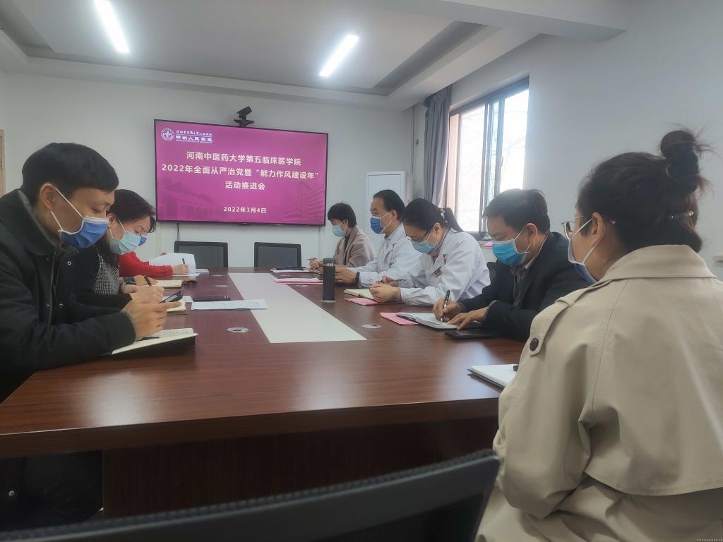 本网讯(文图/孙玉霞)2022年3月4日上午,第五临床医学院召开2022年全面从严治党暨“能力作风建设年”活动推进会。学院班子成员、党支部书记、相关职能部门主任参会,会议由学院党委副书记吕雁主持。