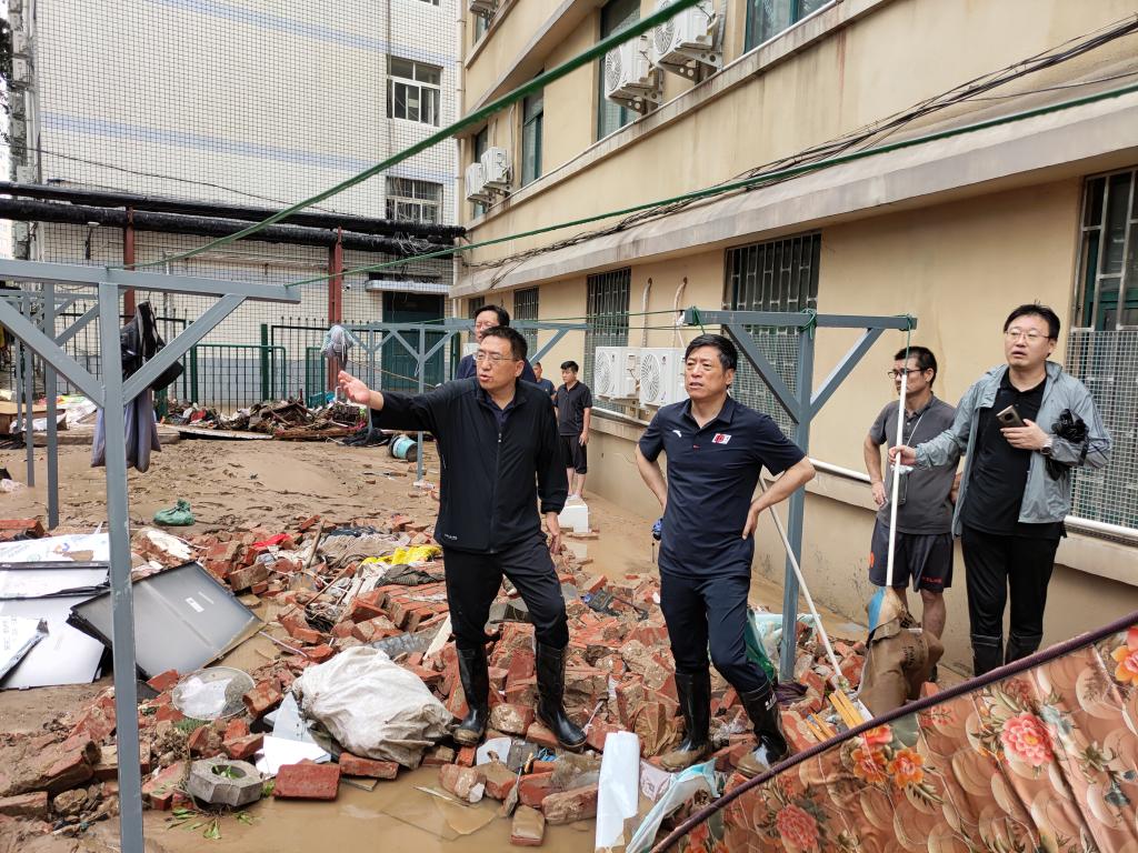 在东明路校区,校领导向受灾转移的学生表示慰问,鼓励大家一定要振奋精神,团结一心,与学校共克时艰。在学生餐厅,校领导详细了解一楼灾后清淤、设备检修、复工准备等工作,并与正在二楼就餐的学生亲切交谈,全面了解大家衣食住行需要;在后厨操作间,校领导仔细询问燃气供应、食材储备等情况,指出要进一步丰富物资储备数量,为师生做好生活服务保障。校领导一行还先后走访了杏林超市、学生宿舍等地,查看了生活用品供应情况、宿舍进水受灾情况、南侧围墙溃口情况,明确要求基建处、人才公寓建设与东明校区管理办公室等部门单位尽快堵塞溃口,严防金水河倒灌,预防灾情再次发生。校领导还深入三附院,与正在排涝的领导班子交谈,希望他们能够尽快排除险情,想方设法恢复电力供应,确保医疗保障服务正常运行。