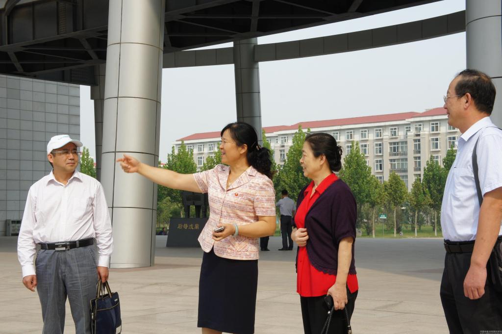 工会副主席曹蕴俐为付莉一行介绍校园景观