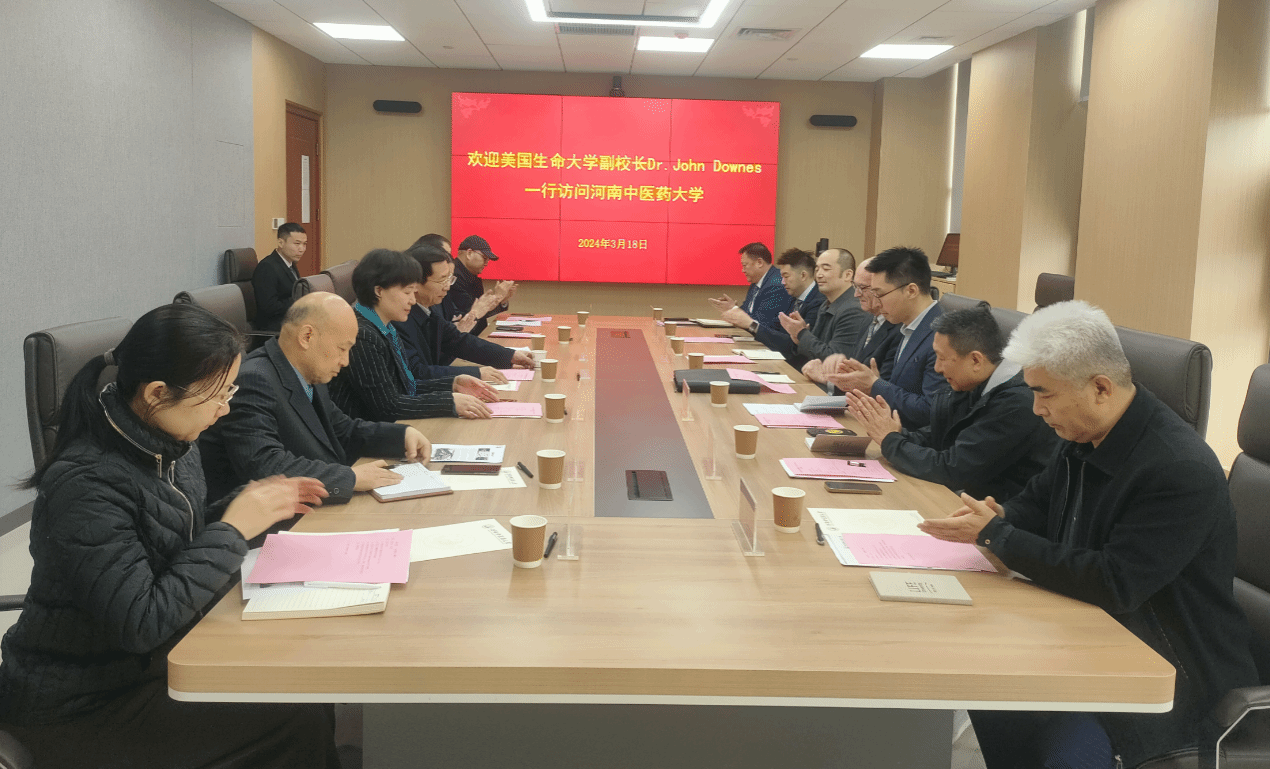 王耀献对Dr.John Downes一行的到来表示欢迎,他向来宾介绍了河南省概况和学校人才培养、科学研究、文化传承创新、社会服务、国际交流合作等情况。王耀献指出,初春三月,万物复苏,是充满希望的季节,河南省政府正在大力推进中医药强省战略,积极推动中医药走出去,惠及世界各国人民,双方相聚洽谈合作正当其时;双方洽谈合作是推进中美友好事业的具体举措,希望两校能够找到共同感兴趣的合作领域,为共建人类卫生健康共同体做出积极贡献。Dr.John Downes表示,在会谈之前参观了大学校园和中医药博物馆,十分震撼,他讲到,美国生命大学在脊骨神经医学方面很有建树,该专业有数以万计的毕业生活跃在医学领域,运动科学研究院设有运动科学、运动训练学、临床营养学以及积极心理学等专业,两校相关专业具有相似互补的特点,希望开展多方面的交流与合作。