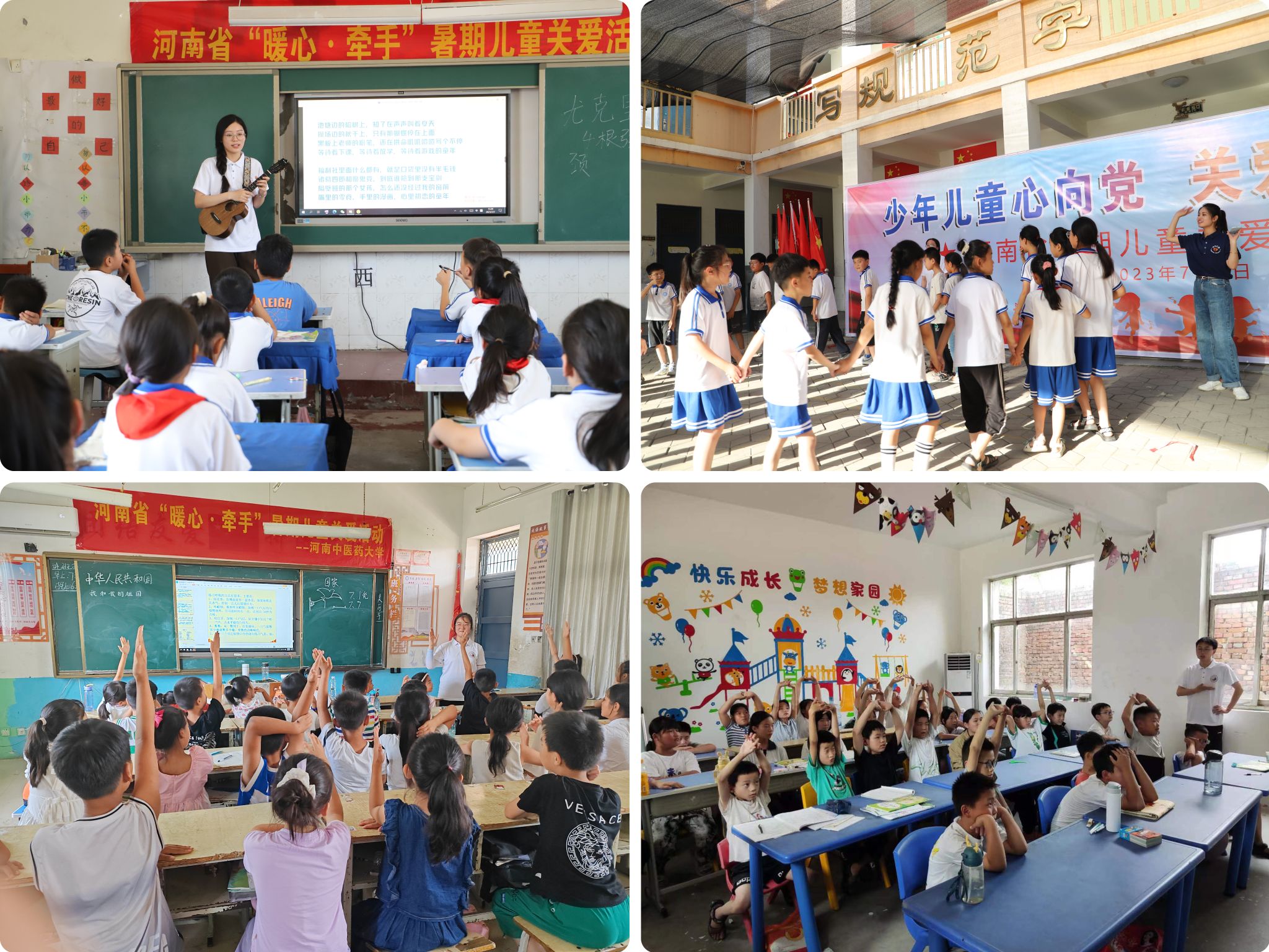 河南省“暖心•牵手”暑期儿童关爱活动是leyu·乐鱼(中国)体育官方网站携手河南省妇联开展的暑期社会心理服务项目,该活动已经持续多年。leyu·乐鱼(中国)体育官方网站每年暑期选拔优秀的班级心理委员组成朋辈心理服务队伍到农村中小学校,通过开展心理健康知识宣讲、团体心理辅导、中医药文化普及、安全知识和爱国主义教育等课程,丰富农村儿童暑期生活,让孩子们度过一个快乐充实的假期。