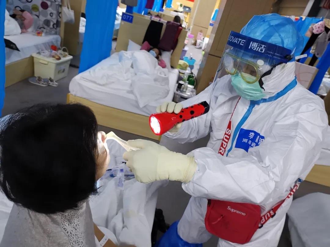 标本采集中,李静波用自己的专业知识与技术能力为患者认真服务,得到了患者们的一致称赞,但是李静波并没有告知患者,咽拭子标本采集的过程对于医护来说是最具传染性的操作。采集中,一个张嘴的动作,意味着可能产生大量携带病毒的飞沫,甚至有没忍住引发的咳嗽、呕吐,哪怕有一丁点穿透防护衣缝隙,采样人员就可能面临感染的风险,这是真正意义上的与病毒近距离面对面的接触。面对这样高风险的操作,李静波他们更关心的是如何在患者没有不适的情况下快速取到标本。治身亦治心,援鄂医疗队员们夜以继日的奋战在疫情一线,他们用自己的爱心、耐心以及战胜病魔的坚定决心,书写出了白衣战士们的“医者仁心”。