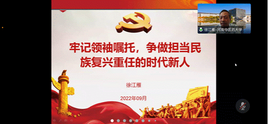 本网讯(文/张羽萍 图/刘思嘉)2022年9月28日下午,校党委委员、副校长徐江雁以“牢记领袖嘱托,争做担当民族复兴重任的时代新人”为题,通过腾讯会议平台为康复医学院师生党员讲“开学第一课”。康复医学院领导班子成员以及全体师生党员共同聆听,“开学第一课”由康复医学院党委书记张运克主持。