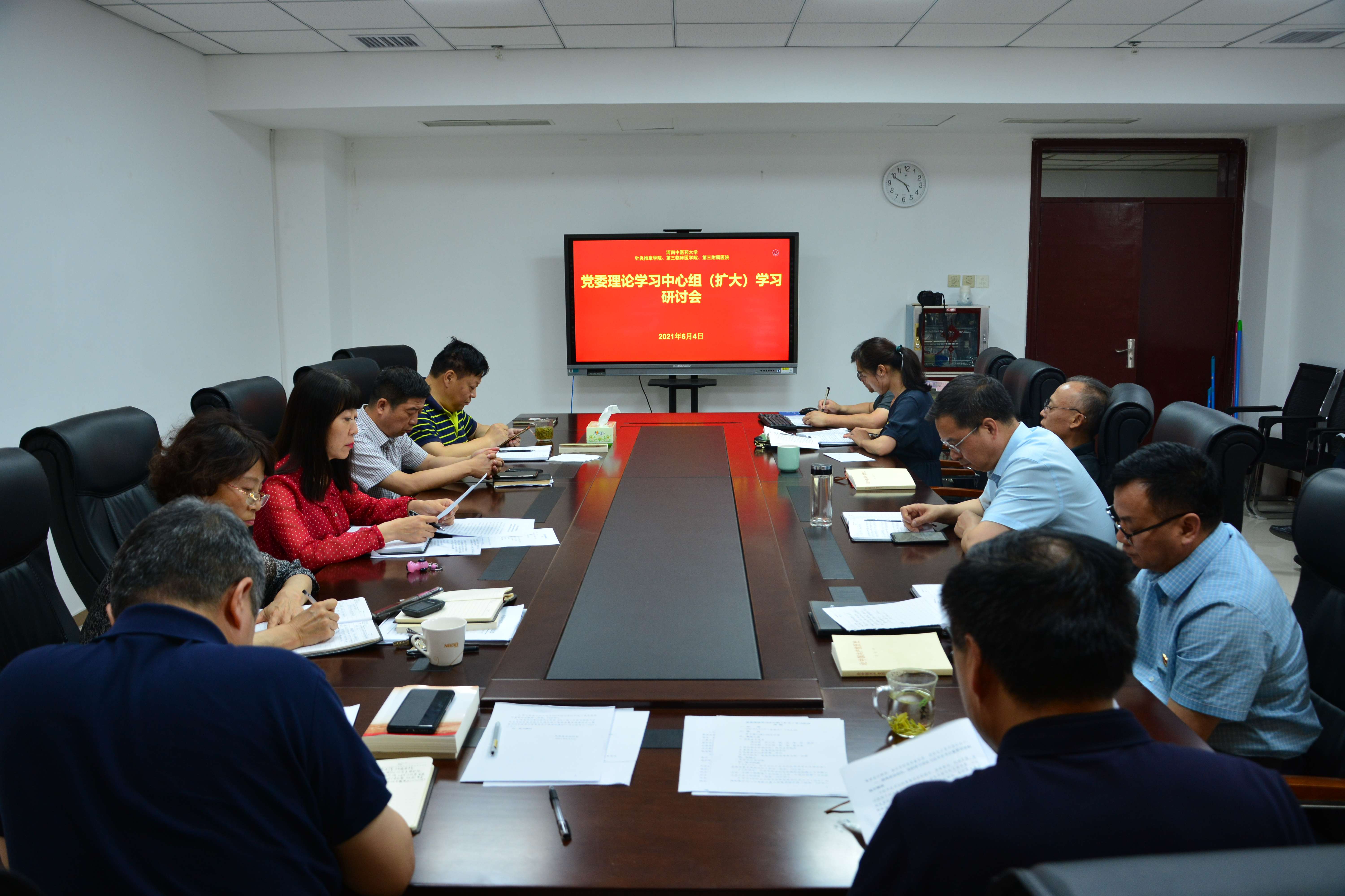 本网讯(文/图 潘向昆)2021年6月4日下午,三附院党委理论学习中心组在1号楼1106会议室召开扩大学习研讨会,专题学习贯彻习近平总书记在推进南水北调后续工程高质量发展座谈会和在两院院士大会和中国科协第十次全国代表大会上的重要讲话精神。院领导班子成员和各党总支、直属党支部书记及相关部门负责人参加会议。会议由院党委理论学习中心组组长、党委书记周运峰主持。