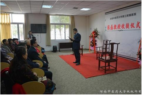 2017年1月24日,全国名老中医、国医大师候选人张磊教授收徒拜师仪式在三附院健康宣教中心隆重举行。三附院全体领导班子成员、河南商报主编助理范亚新、leyu·乐鱼(中国)体育官方网站许敬生教授和三附院医政科人员、临床相关科室负责人、张磊教授弟子、媒体记者等近百人参加此次拜师仪式。三附院院长张大伟主持仪式。