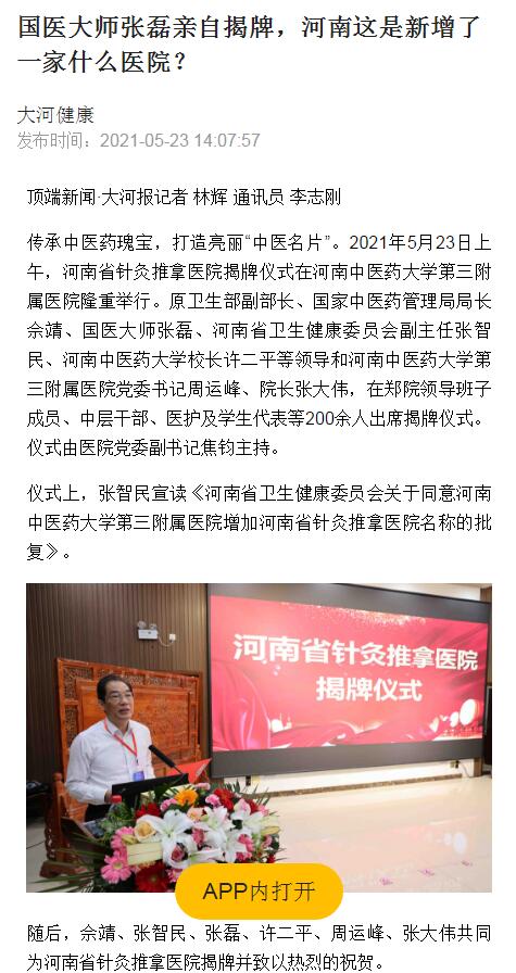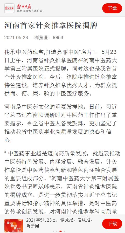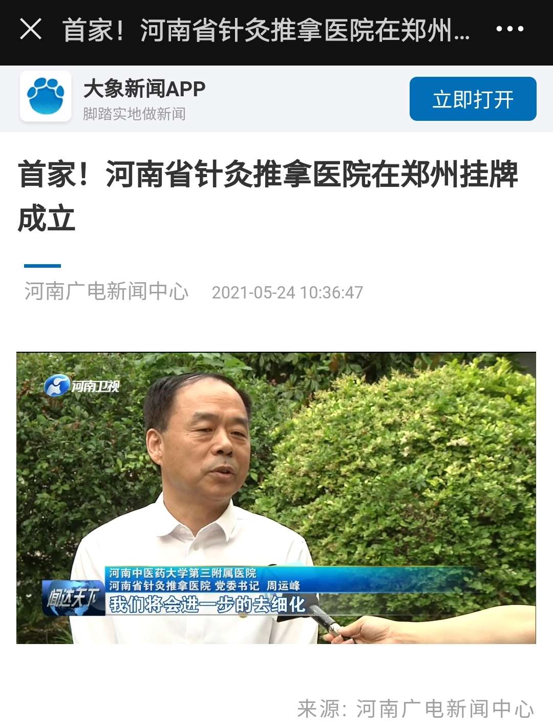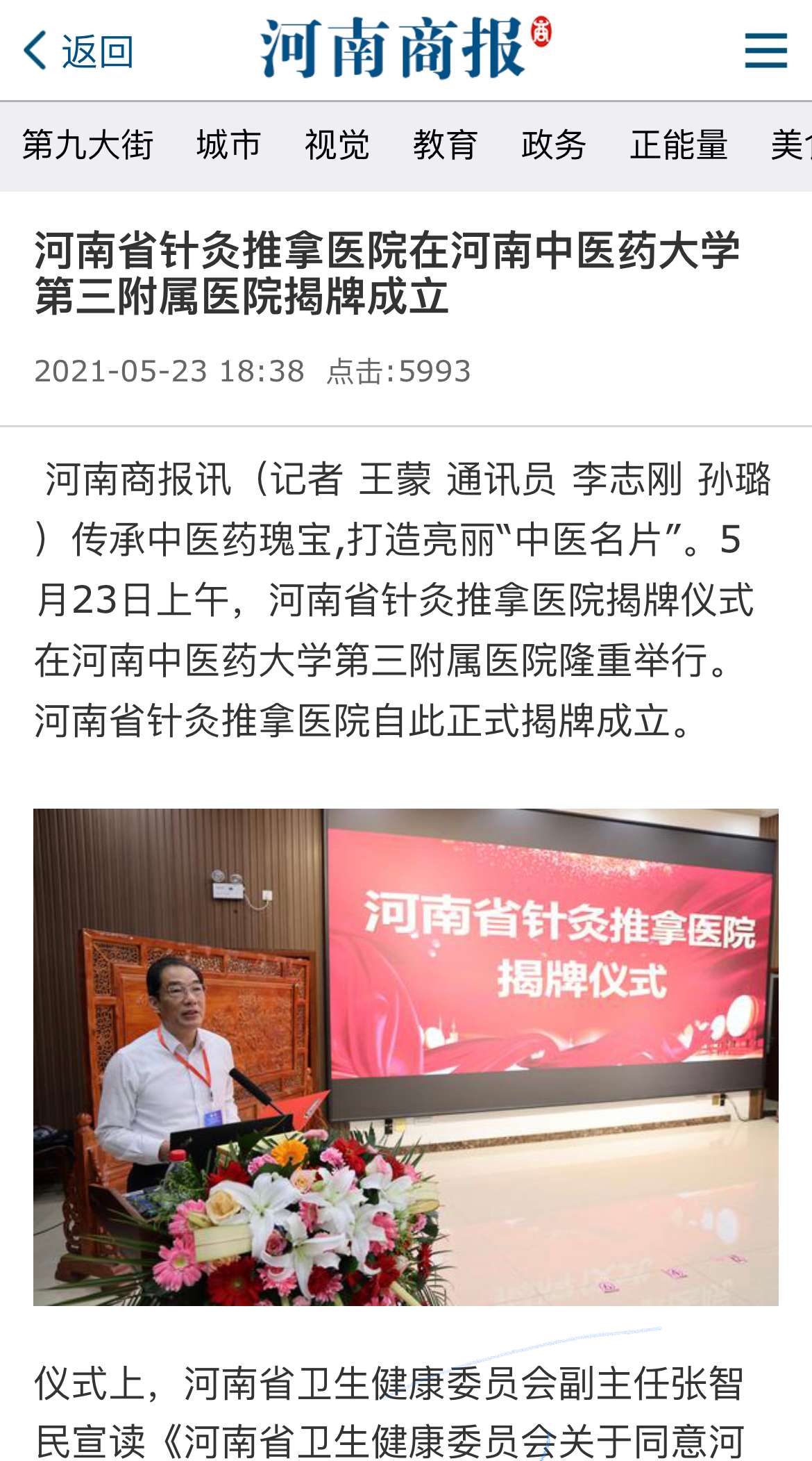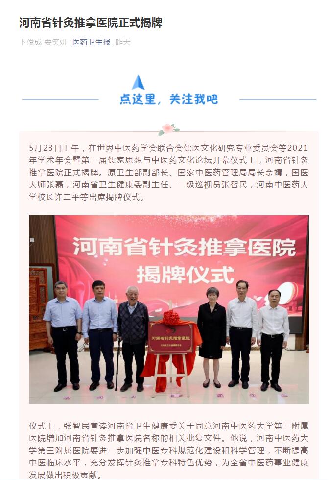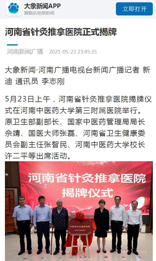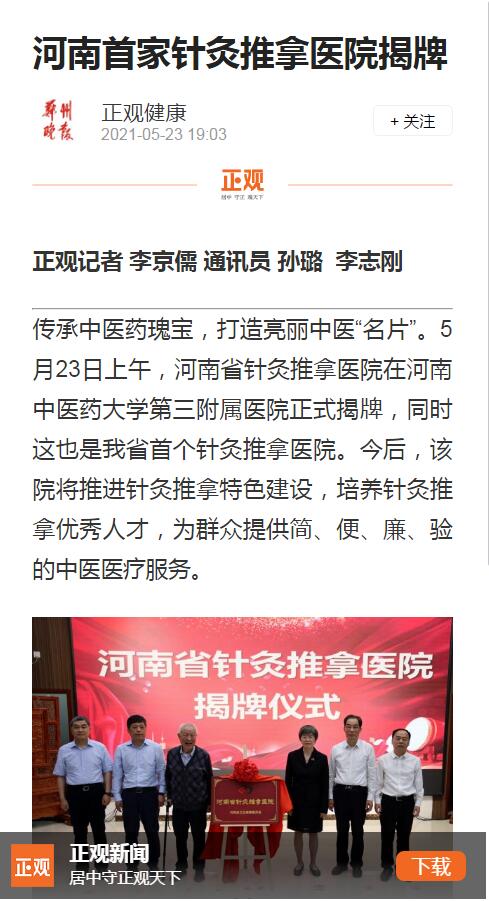 编者按:为传承中医药瑰宝,打造亮丽“中医名片”,2021年5月23日上午,河南省针灸推拿医院揭牌仪式在三附院举行。河南卫视、河南日报网、郑州日报、医药卫生报等多家媒体纷纷报道。