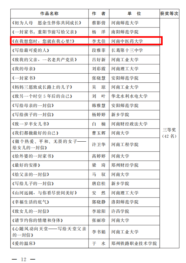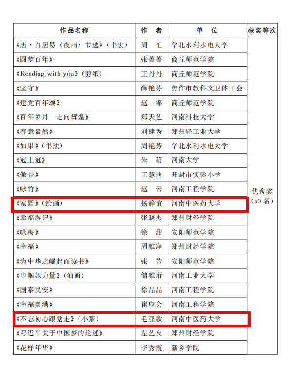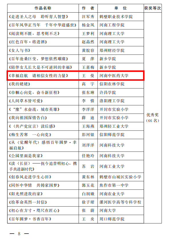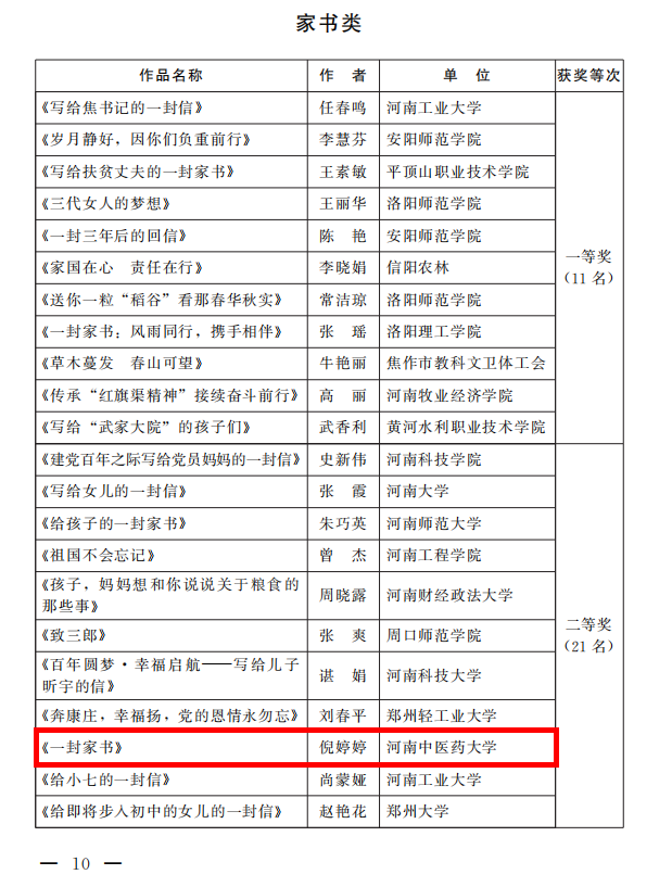 接到通知后,leyu·乐鱼(中国)体育官方网站工会女工委高度重视、精心组织,基层工会女工委广泛宣传,女教职工们热情响应,活动共收到各类作品45件,经过学校女工委委员和专家组认真评选,推荐出19件作品参加了省教科文卫体工会“书香三八”读书活动。最终leyu·乐鱼(中国)体育官方网站8件作品荣获奖项,其中二等奖2名、三等奖3名、优秀奖3名。周红霞的《有一种妈妈,叫医生的妈妈》获征文类二等奖、倪婷婷的《一封家书》获家书类二等奖,兰岚的《写给一百年前中国青年的一封信》、王婧雅的《百年峥嵘路 世代永相传》获征文类三等奖、李尤佳的《在我想您时,您就在我心里!》获家书类三等奖,王曼的《幸福启航 请相信女性的力量》获征文类优秀奖,杨静谊的《家园》、毛亚歌的《不忘初心跟党走》获书画类优秀奖。