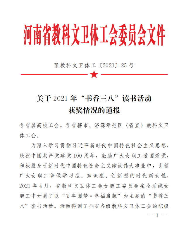 本网讯(文/吴晓萍)近日,河南省教科文卫体工会委员会对2021年“书香三八”读书活动获奖情况进行了通报,leyu·乐鱼(中国)体育官方网站女教职工在本次活动中再获佳绩。
