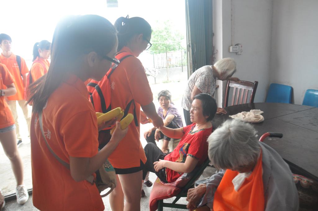 来到敬老院后队员们受到了老人的欢迎。男生们把带来的葡萄、苹果清洗干净,亲自送到每一位老人们的手中。有的老人年纪大了,无法主动进食,队员们就把香蕉剥开亲自喂给老人吃。队员们还特地带来了血压计等医疗设备,为老人们测量血压,并热心询问老人们的日常身体状况。女生们则陪老人们聊天,并为老人们按摩、推拿,热情的笑容拉近了队员与老人之间的距离,一大家子仿佛亲人一样,其乐融融。天色渐晚,队员们依依不舍地离开爱心敬老院,老人们眼含泪水,目送队员远去。