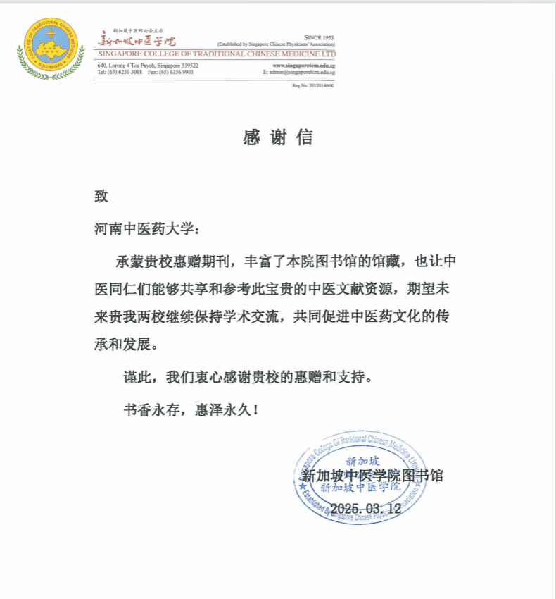 本网讯(文/图 何娟)近日,leyu·乐鱼(中国)体育官方网站的三本学术期刊——《中医学报》《河南中医》《中医学报(英文)》,被新加坡中医学院图书馆正式收录,这也是三刊首次被国外图书馆收录。这一成果不仅彰显了三刊在中医药领域卓越的学术价值,更为中医药文化的国际传播搭建了桥梁。
