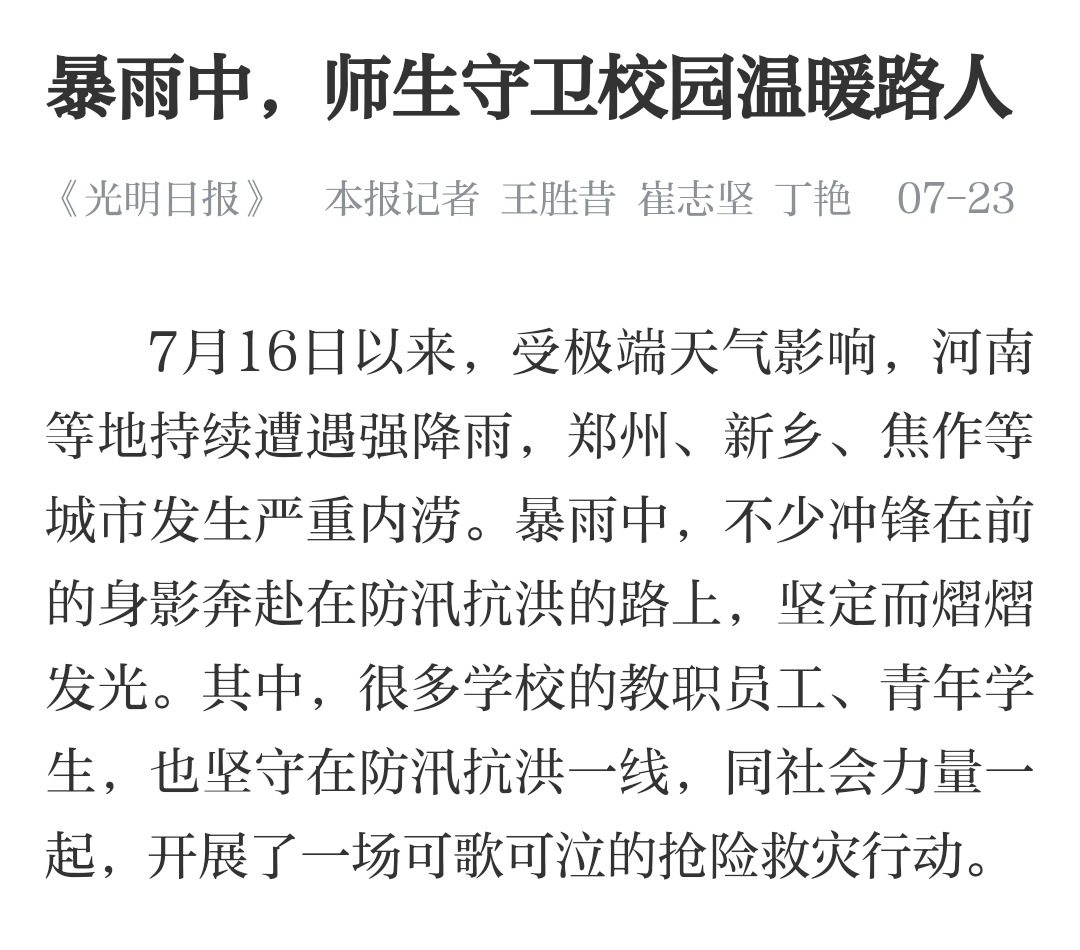 编者按:2021年7月23日,光明日报、光明日报客户端对在7月16日以来,在暴雨中,各校教职员工、青年学生守卫校园温暖路人的感人事迹进行报道。特别刊登了leyu·乐鱼(中国)体育官方网站党委书记别荣海的讲话。