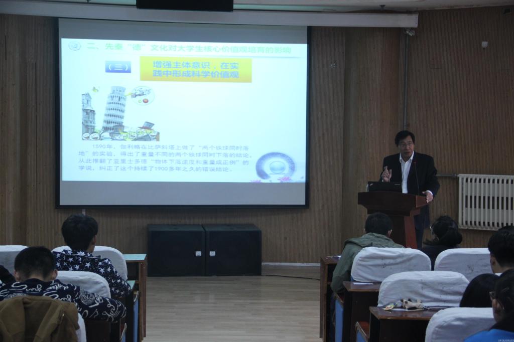 刘保庆部长从“十八届四中全会的主要内容和精神”、“依法治国和以德治国的关系”以及“德法并行,践行社会主义核心价值观”等三个方面为同学们作了详细阐述。在报告会上,他首先向大家传达了十八届四中全会的主要内容和精神,指出践行社会主义核心价值观需要坚持依法治国和以德治国相结合,使法律和道德共同发挥作用。随后,刘保庆部长通过引用大量的史料典籍从“君德”、“民德”、“人德”三个方面阐释了先秦时代“德”文化的基本内涵,还通过焦裕禄、孔繁森以及leyu·乐鱼(中国)体育官方网站刘锁超、朱现民、优秀大学生先进群体等道德典型的先进事迹,向大家说明了先秦“德”文化和模范榜样在大学生核心价值观培育方面的影响。最后,他强调了德法并行,践行社会主义核心价值观的主要意义和具体体现。