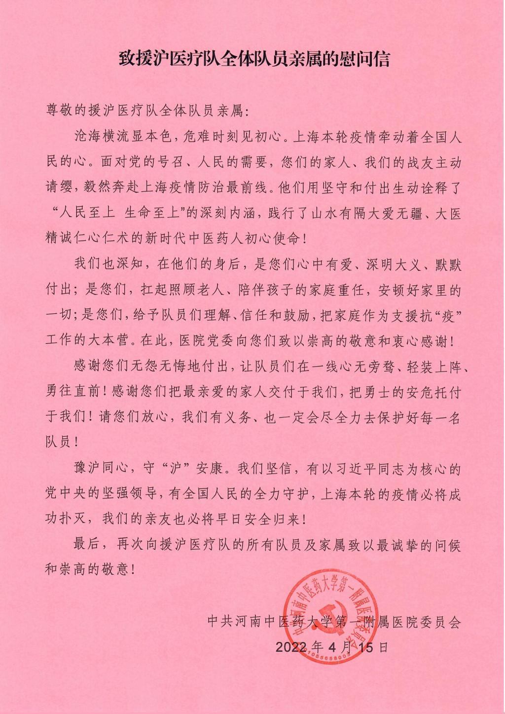 2022年4月15日,医院党委印发《致援护医疗队全体队员亲属的慰问信》,向队员亲属表达崇高敬意和衷心感谢。