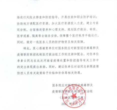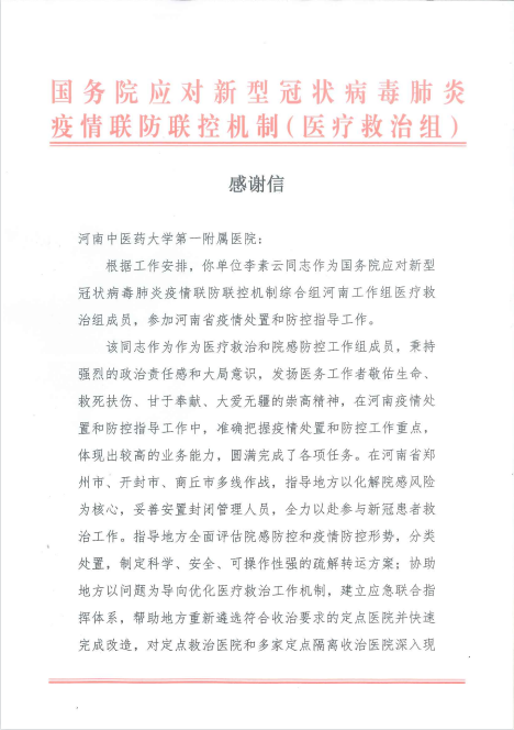信中表示,李素云教授作为医疗救治和院感防控工作组成员,秉承强烈的政治责任感和大局意识,发扬医务工作者敬佑生命、救死扶伤、甘于奉献、大爱无疆的崇高精神,在河南疫情处置和防控指导工作中,准备把握疫情处置和防控工作重点,体现出较高的业务能力,圆满完成了各项任务。