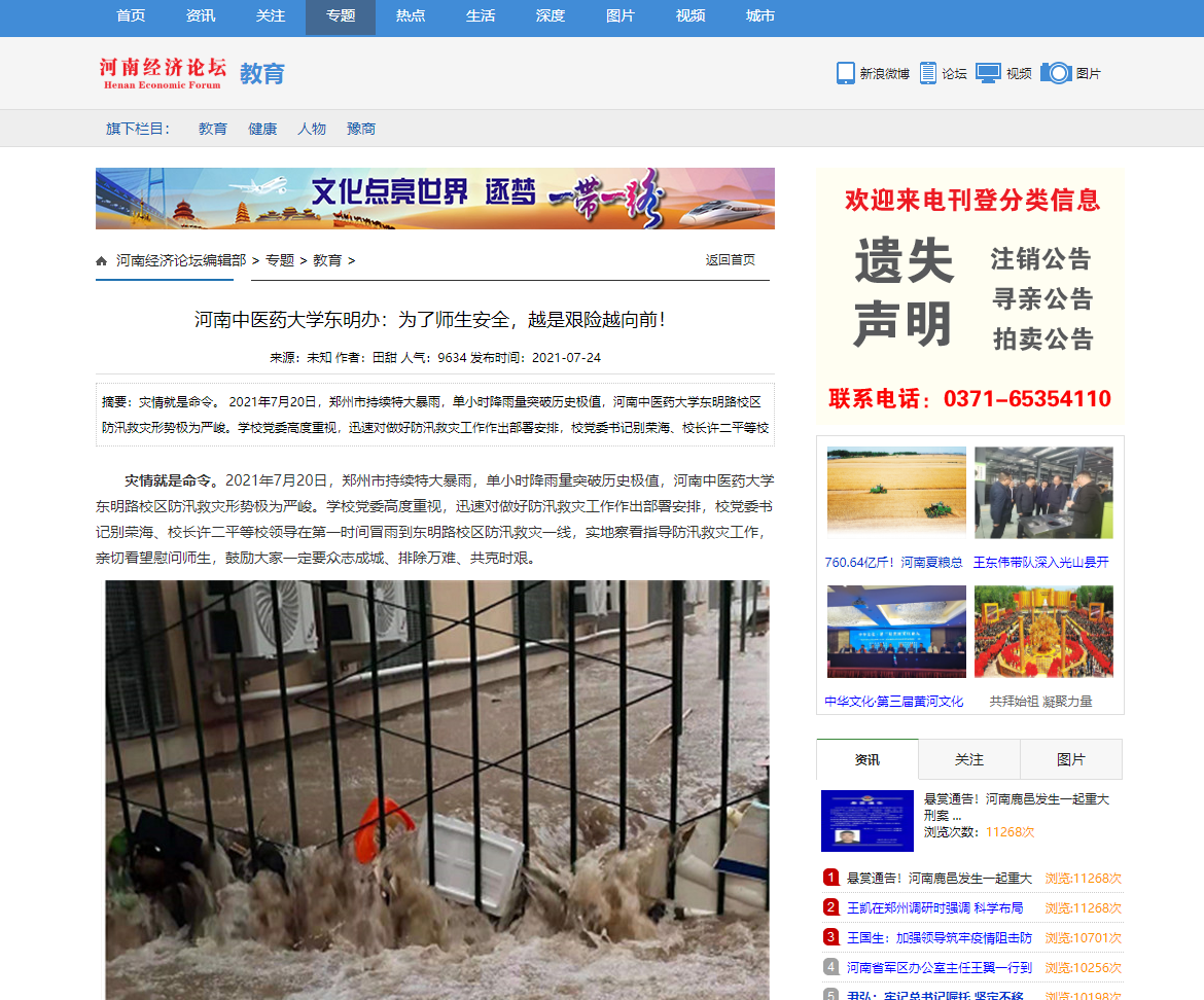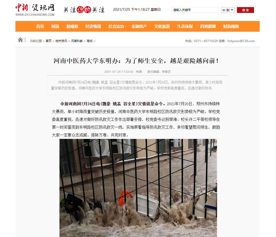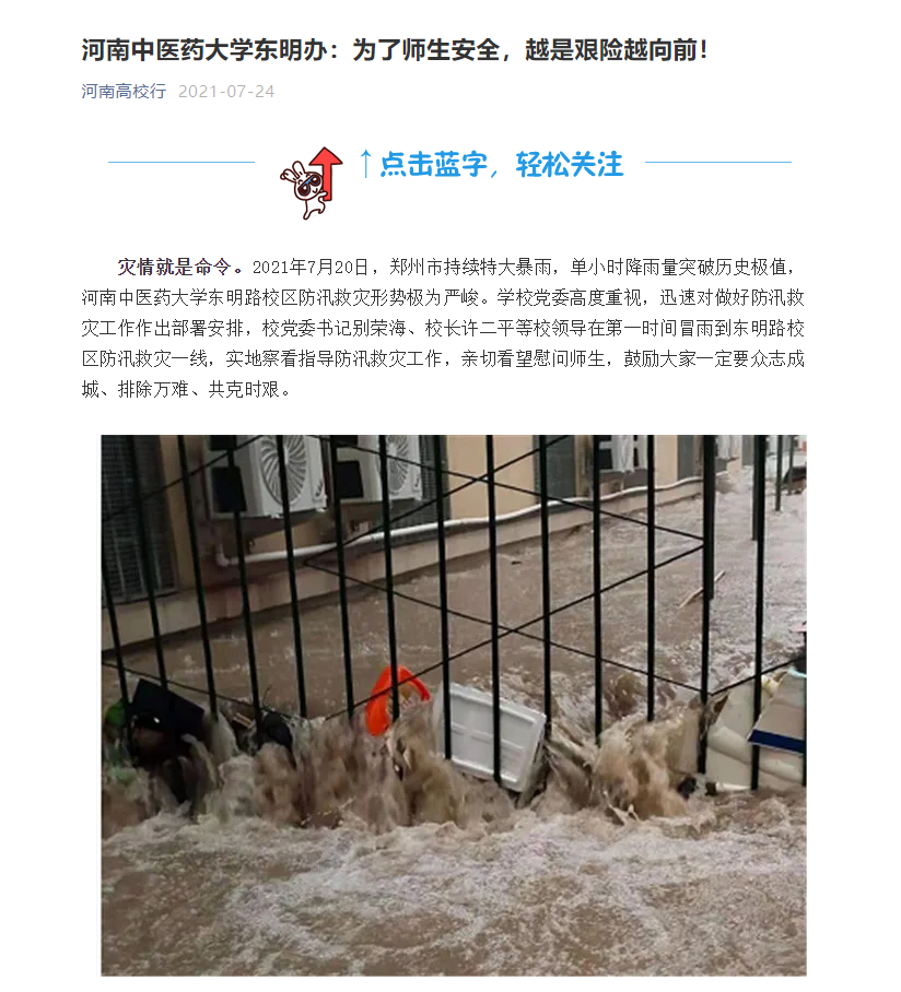 编者按:2021年7月24日-26日,新华网客户端、中华高校网、中新资讯网、河南高校资讯网、新豫网、河南经济论坛、河南高校行等媒体对leyu·乐鱼(中国)体育官方网站党委书记别荣海、校长许二平等校领导在暴雨发生后第一时间到东明路校区防汛救灾一线,实地察看指导防汛救灾工作,亲切看望慰问师生进行报道。