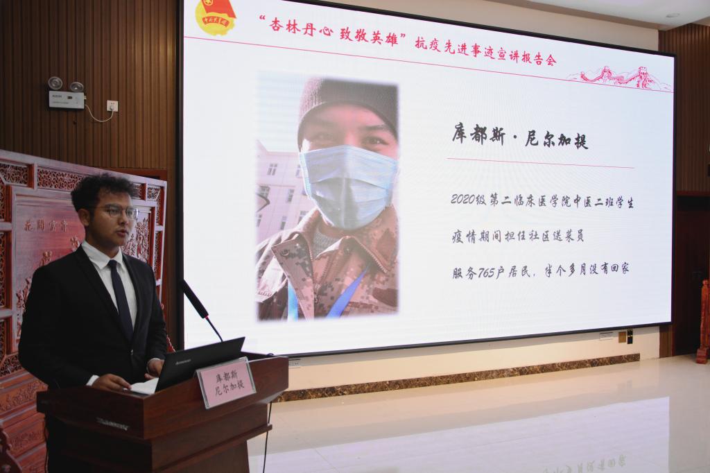 报告会上,巾帼不让须眉、勇敢逆行的青年博士芦晓帆,在后勤岗位上默默奉献、守好校园疫情防控主战场的王明迪,此生无悔入江夏的护理“老兵”马莉,为社区756户居民义务送菜的库都斯·尼尔加提,彰显青春力量的“90后”护士邵青青,五位宣讲人用朴实的语言,从不同角度、不同侧面向大家分享了自己及同事在抗疫一线的经历,讲述了医疗队与武汉人民并肩作战、守望相助的动人事迹。报告会上,每一位宣讲人发自肺腑的讲述感人至深、催人奋进,参会人员不断报以热烈的掌声。