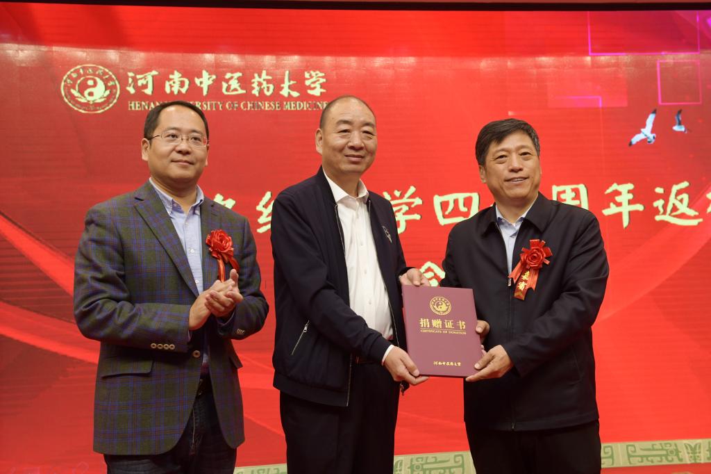 会上,校友杨国营代表七九级全体同学向母校敬赠国医大师李振华教授雕像,许二平代表学校接受捐赠并颁发捐赠证书,同时向七九级同学代表赠送校友杂志和校徽。