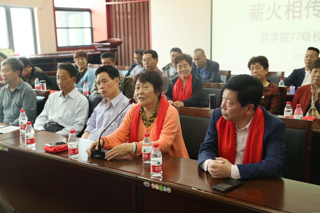 会上,药学院党委书记陈随清首先向校友们百忙之中返回母校表示了热烈的欢迎和衷心的感谢。然后,从专业设置、培养层次、师资队伍、硬件条件等方面向77级校友介绍了药学院自成立以来的发展情况。同时,也希望老学长们能够传经授宝,不吝赐教。时任77级团支部书记、原药品评审中心主任崔援军代表校友发言,讲述了他们那个年代的时代背景以及大学时期的学习生活,当时艰苦的条件和对知识渴求的态度让同学们为之动容。在提问环节,77级校友们以其丰富的人生阅历和独到的见解为药苑学子们答疑解惑,指点迷津。针对学生们考研与就业的抉择问题,崔援军老师指出:同学要根据自己的实际情况来决定是否考研,对大家来说,学历提升固然重要,但一定要拥有优秀的实践能力。针对学生们关心的用人单位对人才的素质要求、职业生涯中重要的影响因素以及药厂、药检所、药监局等单位的工作内容等问题,郑州市食品药品检验所所长康辉,洛阳市食品药品检验所所长刘瑛、安阳药监局药政科科长刘端方、河南诺美药业公司负责人王伯俭、天方药业原技术总监王伟等校友分别结合自身经历,与大家分享了宝贵经验和见解。陈随清书记在总结讲话中指出,现在的学生是幸福的一代,同时也是迷茫的季节,感谢在座的校友从自身经历出发,引导教育同学们选择就是责任,应无怨无悔,为实现自我价值拼搏奋斗,你们的解答充满真情实意,让人感动。药苑学子更应努力学习知识,提升素质能力,勇担中医药事业振兴发展重任,做到干一行爱一行,行行出状元。会后,77级校友和药学院师生一起合影留念。
