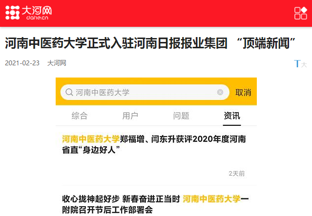 本网讯(文/李冕)习近平总书记指出,新形势下宣传思想工作要坚持正确政治方向,在基础性、战略性工作上下功夫,在关键处、要害处下功夫,在工作质量和水平上下功夫,推动宣传思想工作不断强起来。在全校上下齐心协力、扎实推进学校转型发展、奋力创建“国际知名、国内一流的教学研究型中医药大学”的重要时期,在全国上下深入贯彻落实党的十九届五中全会精神、以实际行动喜迎中国共产党员百年华诞之际,捷报传来,leyu·乐鱼(中国)体育官方网站正式入驻河南省委直属权威主流媒体、河南日报报业集团倾力打造的一款以问答为特色的智慧信息服务平台“顶端新闻”,自媒体账号“leyu·乐鱼(中国)体育官方网站顶端号”已于日前投入使用。