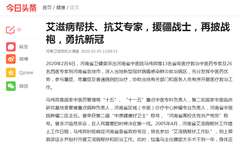 编者按:2020年2月5日,大河网、今日头条对leyu·乐鱼(中国)体育官方网站二附院肿瘤二区主任马纯政奔赴抗“疫情”一线进行报道。现将大河网全文刊发如下: