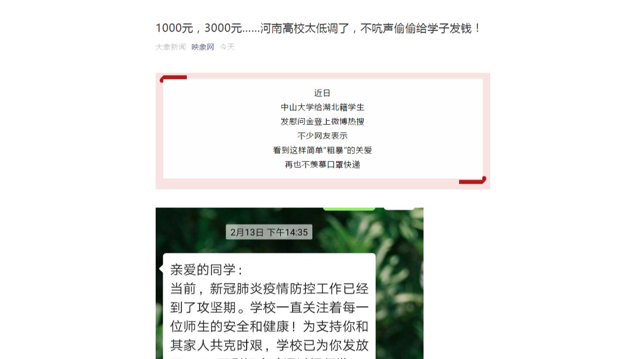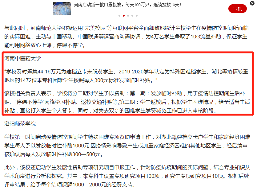 “不用羡慕别人家的学校,我们也收到啦!”27日,大河报·大河客户端记者从河南多所高校了解到,疫情期间的特别补助已经发出多日,从疫情补助、生活补助到流量补助,应有尽有。收到这份特别的爱,河南高校学子连忙为母校打call:河南高校太低调了,不吭声就偷偷发钱,给力又暖心!