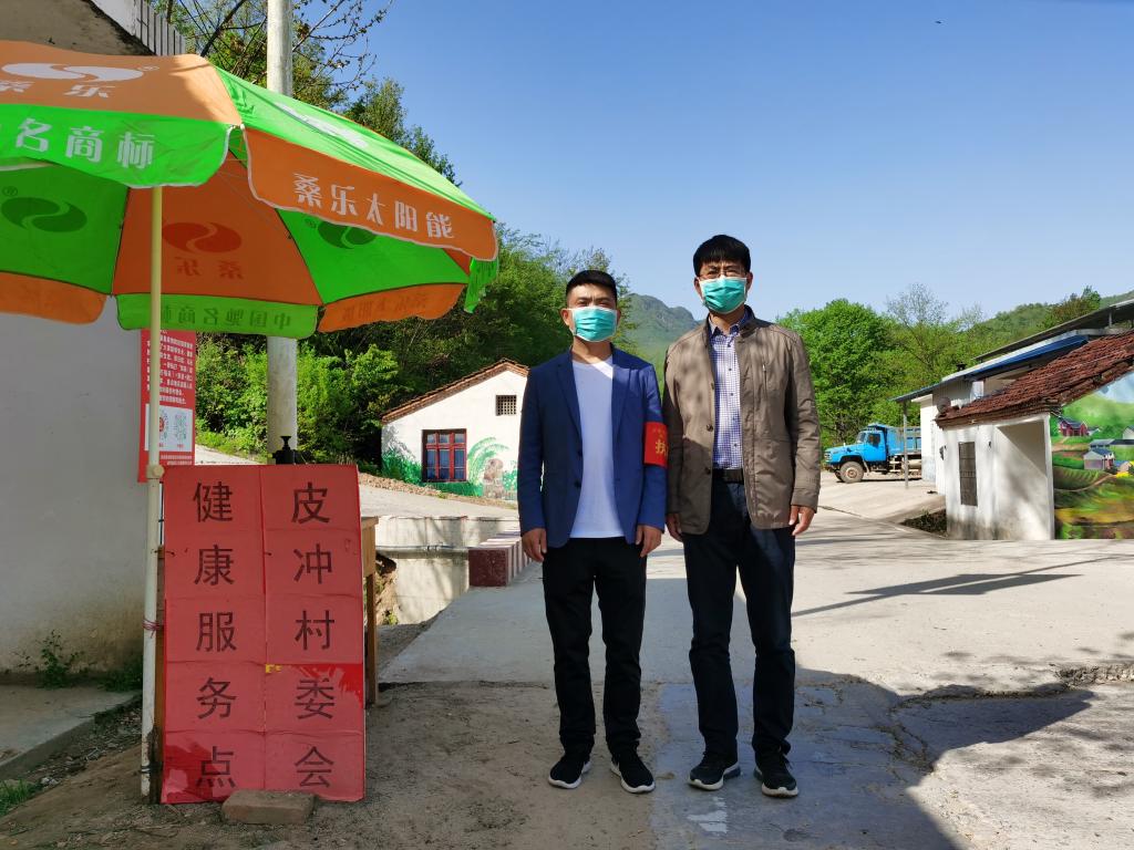 驻村第一书记胡斌、驻村第一团支部书记马运锋在皮冲村口卡点值班