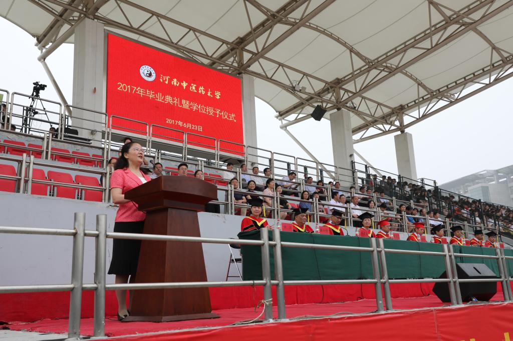校长许二平深情寄予毕业学子。校长衷心地祝贺在座的每一位毕业生都通过刻苦学习,顺利完成学业,开始新的人生旅程。临行之际,校长还对毕业生寄予几点厚望:第一,努力学习,做奋力拼搏的人。毕业绝不意味着学习的结束,而是新的学习生活的开始,要树立起终身学习的意识、养成终身学习的习惯、培养终身学习的能力。面对日新月异的现代社会,只有奋力拼搏才能赢得成功,只有奋力拼搏才能享受成功的喜悦。第二,相互尊重,做与人为善的人。要有“海纳百川”的气度,与人为善,以开放谦虚的心态学习他人的优点。尊重自己、尊重他人、尊重法律法规、尊重道德。第三,牢记使命,做传承创新的人。同学们是幸运的一代,正如习近平总书记所讲,“中医药振兴发展迎来天时、地利、人和的大好机遇”。中医药事业已上升为国家战略,《中医药法》已经出台,中医药在国外也越来越受到重视。要牢记使命,顺势而为,勇于担当,传承中医药、宣传中医药,为推动中医药事业更好更快发展做出自己的贡献。第四,潜学问道,做关注社会的人。要久久为功,经得起诱惑,耐得住寂寞;要爱岗敬业,练就过硬的技术和本领,干一行爱一行,爱一行精一行。脚踏实地,努力工作。要将自己的梦想主动融入民族复兴、国家富强、人民幸福、社会和谐的中国梦的实现中,要将个人价值的实现同国家的发展、社会的需要紧密相连。最后,许校长表示,母校将会是每一位学子永远的后盾,诚挚地期盼着在座的每一位毕业生能够不背大学之初衷,不辱母校之期待,不负历史之重托,以优异的成绩,为学校、为社会、为人类做出应有的贡献!
