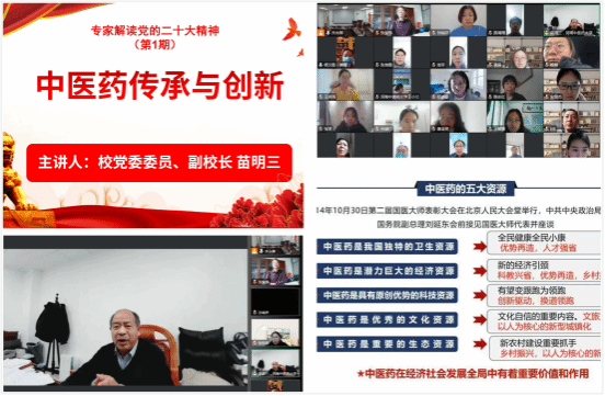 本网讯(文图/乔永辉)为深入学习贯彻落实党的二十大精神,中医药科学院组织了专家解读党的二十大精神系列活动。2022年12月20日下午,中医药科学院首期特邀校党委委员、副校长苗明三于线上为全院师生党员讲授题为《中医药传承与创新》的党课,深入解读党的二十大报告中有关促进中医药传承创新发展的内涵。党课由中医药科学院副院长杨文胜主持。