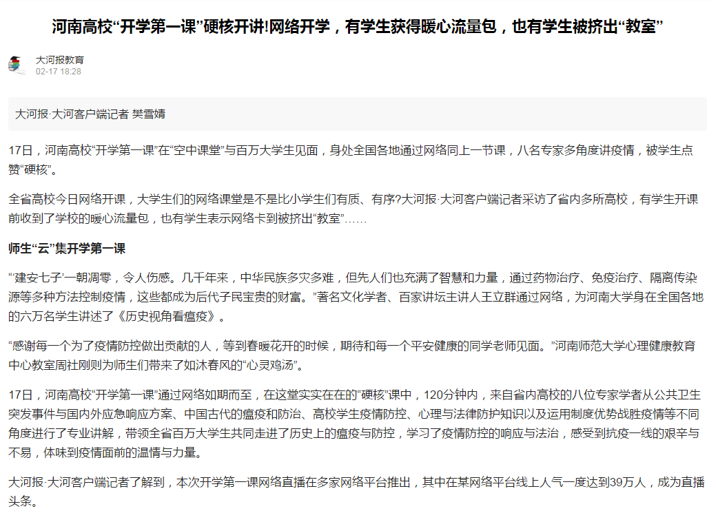 大河报·大河客户端记者了解到,本次开学第一课网络直播在多家网络平台推出,其中在某网络平台线上人气一度达到39万人,成为直播头条。