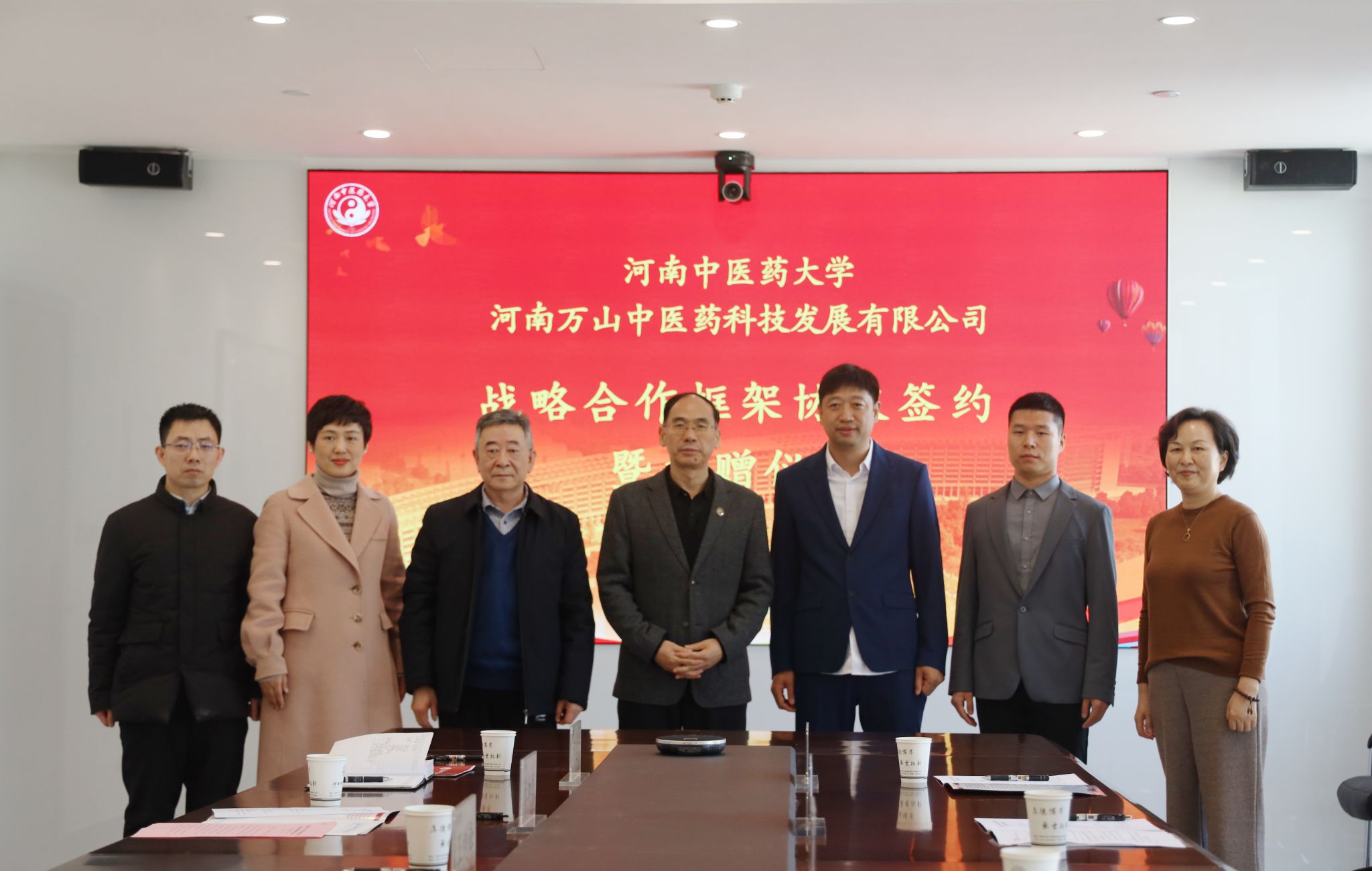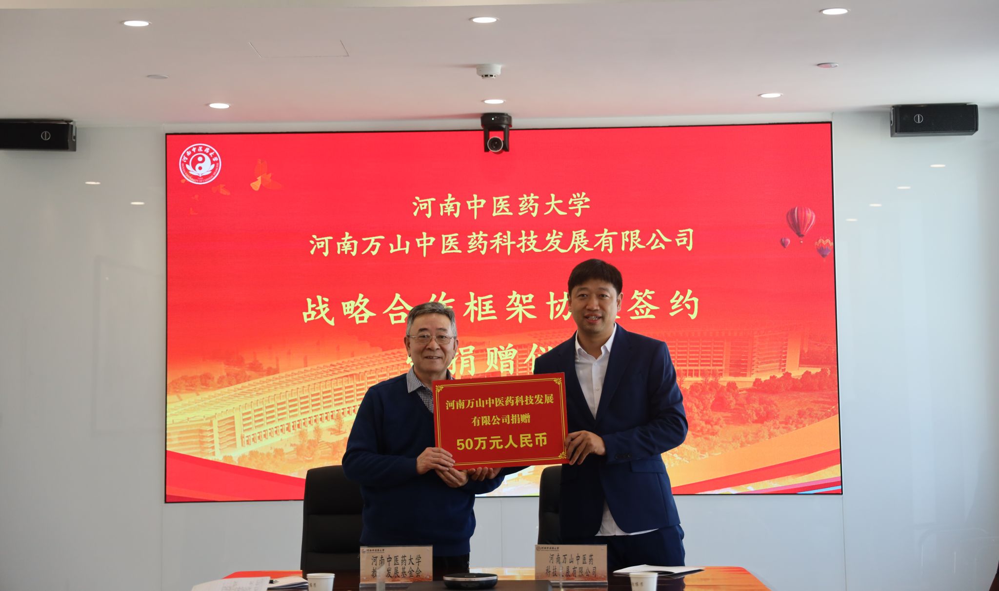 张加民代表学校对赵来宾先生一行的到来表示热烈欢迎,对河南万山中医药科技发展有限公司慷慨捐赠50万元的善举表示诚挚的感谢。张加民表示,双方以资源共享、优势互补为原则,在人才培养、科学研究等方面开展合作,对于建设中医药强省有着重要意义。学校将充分利用好捐赠资金,加快推动学校内涵建设,不断提升治理能力、育人能力和创新能力,为中医药事业发展做出新的贡献。