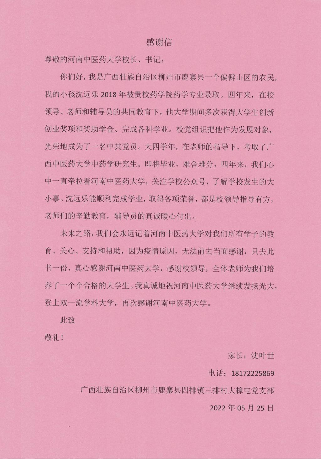 本网讯(文/姚湘 图/李媛媛)正值2022年毕业季,在这个告别与重新启程的时刻,本草书院收到了一份特别的礼物,一封来自2022届优秀毕业生药学本科班沈远乐家长的感谢信。信中沈远乐同学家长沈叶世先生对学校四年来给予其孩子的培养和教育表示感谢,为学校未来发展送上美好祝愿。