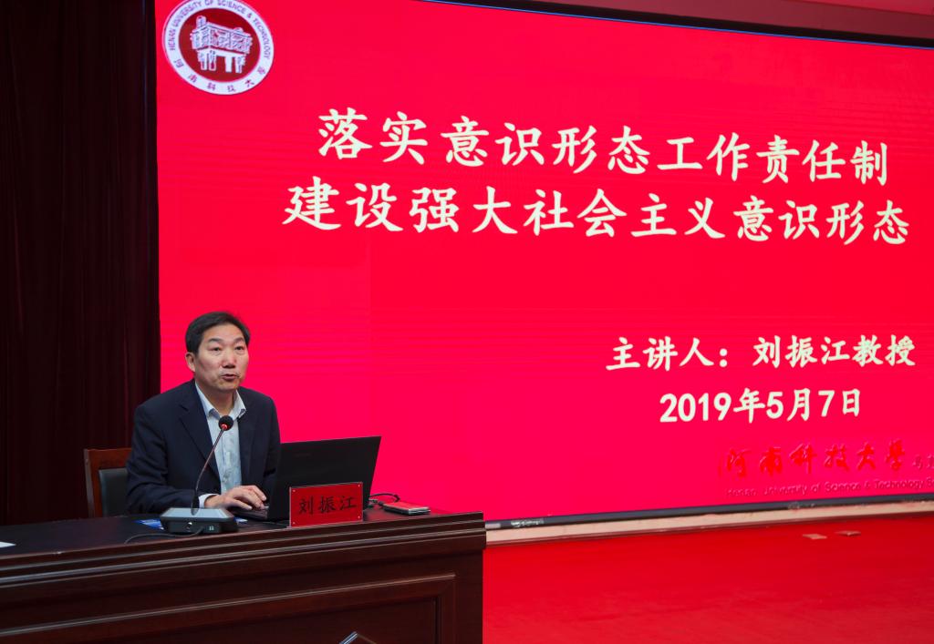 会上,河南科技大学马克思主义学院院长、河南省社科联兼职副主席刘振江教授应邀为leyu·乐鱼(中国)体育官方网站党员干部作了题为《落实意识形态责任制建设强大的社会主义意识形态》的专题辅导报告。在报告中,刘振江系统分析了高校意识形态工作面临的各种较量和严峻复杂的斗争局面,强调了“意识形态工作是一项极端重要的工作”,从意识形态工作责任制的提出实施、意识形态工作责任制的内容、各种错误思潮的辨析与破解、主流意识形态的树立与强化四个方面为现场的党员干部进行了全面系统的辅导。整个辅导报告逻辑缜密、分析透彻、论述深刻、旁征博引、生动具体、操作性强,为leyu·乐鱼(中国)体育官方网站指明了建设具有强大凝聚力和引领力的社会主义意识形态的正确方向、主要任务和根本遵循。