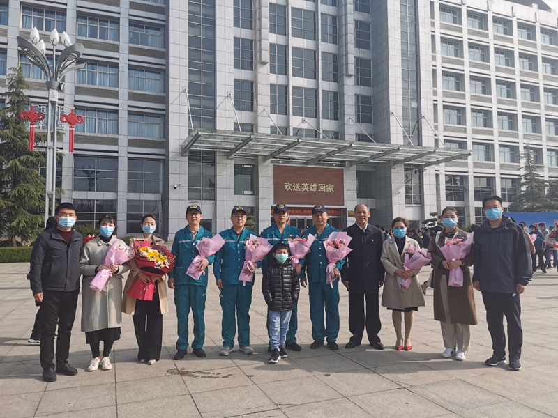 本网讯(文/徐明 图/马运锋)草长莺飞,春和景明。2020年4月3日,河南省援鄂医疗转运队的勇士们结束了14天的医学隔离观察期,终于可以回家,与家人团圆。当天一早,二附院院党委书记王海亮来到郑州市委党校,迎接最早一批赴武汉、参加转运队的4名英雄——邵圣洁、刘杰、代云祥、李浩亮回家。