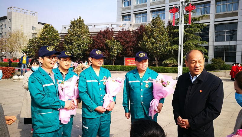 在简单而隆重的迎接仪式后,二附院党委书记王海亮为圆满完成任务的4位勇士献上鲜花,并代表二附院全体教职工生对勇士们表示了崇高的敬意和衷心的感谢,与大家亲切交谈,仔细询问他们的生活和身体健康情况。
