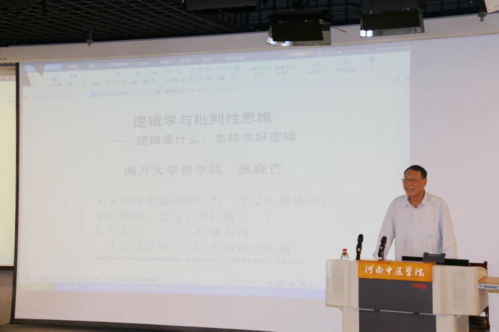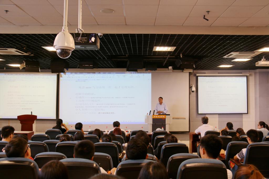 张晓芒教授以“逻辑和批判性思维”为题,阐释了什么是逻辑、逻辑的作用、怎样学好和用好逻辑三个问题,重点讲述了逻辑作为“思维的斧子”的作用。张晓芒教授首先以问答形式,用趣味问题激发了同学们对逻辑学的兴趣,然后结合现实生活,通过对“中国式过马路”、“老人扶不扶”、“面试”等热点问题的讨论分析,说明了逻辑学能够从现实性的角度培养学生的思维素质这一重要特点。接着,张晓芒教授又从八个方面论证了这一观点:培养认识世界的方法;突破经验逻辑的束缚;提高沟通交际能力;提高批判性思维能力;提高人文精神;提高创新能力与创新精神;有助于应试社会逻辑考试;培养逻辑精神。这八个方面充分说明了逻辑是生活的逻辑,是实用的逻辑。张晓芒教授认为,人生是处于不断试错中的,经验来自于对错误选择的纠错,所以建议大家要养成“找毛病”的习惯,培养批判性思维,以达到“诚者,天之道也;诚之者,人之道也”的境界。张晓芒教授的报告内容丰富,讲解生动,紧密联系现实生活,展现了其丰富的学识,为同学们描绘了不一样的逻辑世界,赢得了与会师生的一致好评。