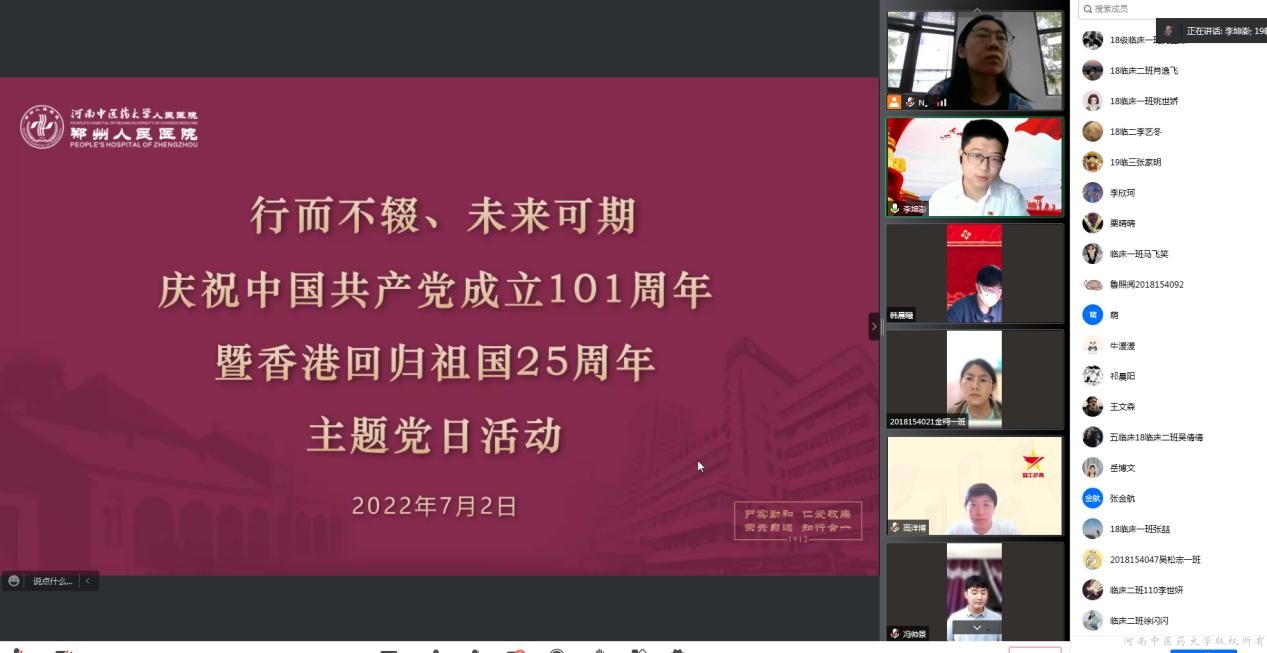 本网讯(文/高洋博 图/夏文娜)2022年7月2日上午,第五临床医学院学工办党支部、学生党支部以线上形式联合开展“行而不辍、未来可期,庆祝中国共产党成立101周年暨香港回归祖国25周年”主题党日,支部党员、预备党员、入党积极分子90人参加。