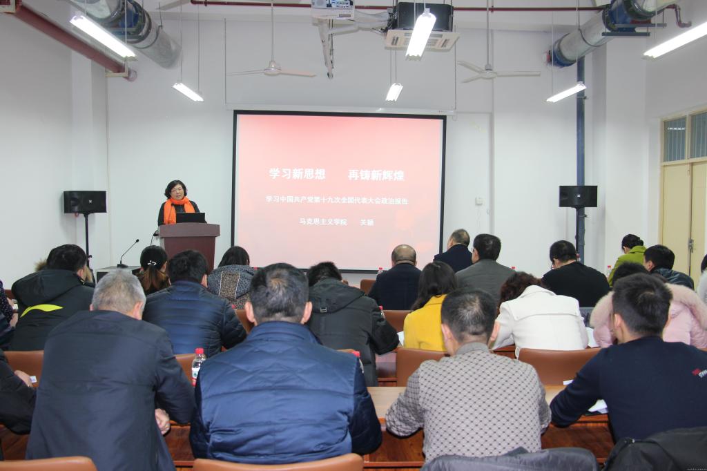 关颖教授以《学习新思想再铸新辉煌》为题,从“新思想的产生——中国特色社会主义进入了新时代”、“习近平新时代中国特色社会主义思想面对的时代课题”、“习近平新时代中国特色社会主义思想的主要内容”、“如何坚持以习近平新时代中国特色社会主义思想为指导”等四个方面对习近平新时代中国特色社会主义思想进行了深刻解读,阐明了习近平新时代中国特色社会主义思想的时代背景、历史贡献、理论特色和实践要求。她最后强调,学懂弄通十九大报告的目的就是要用理论指导实践,学习新思想,再铸新辉煌。