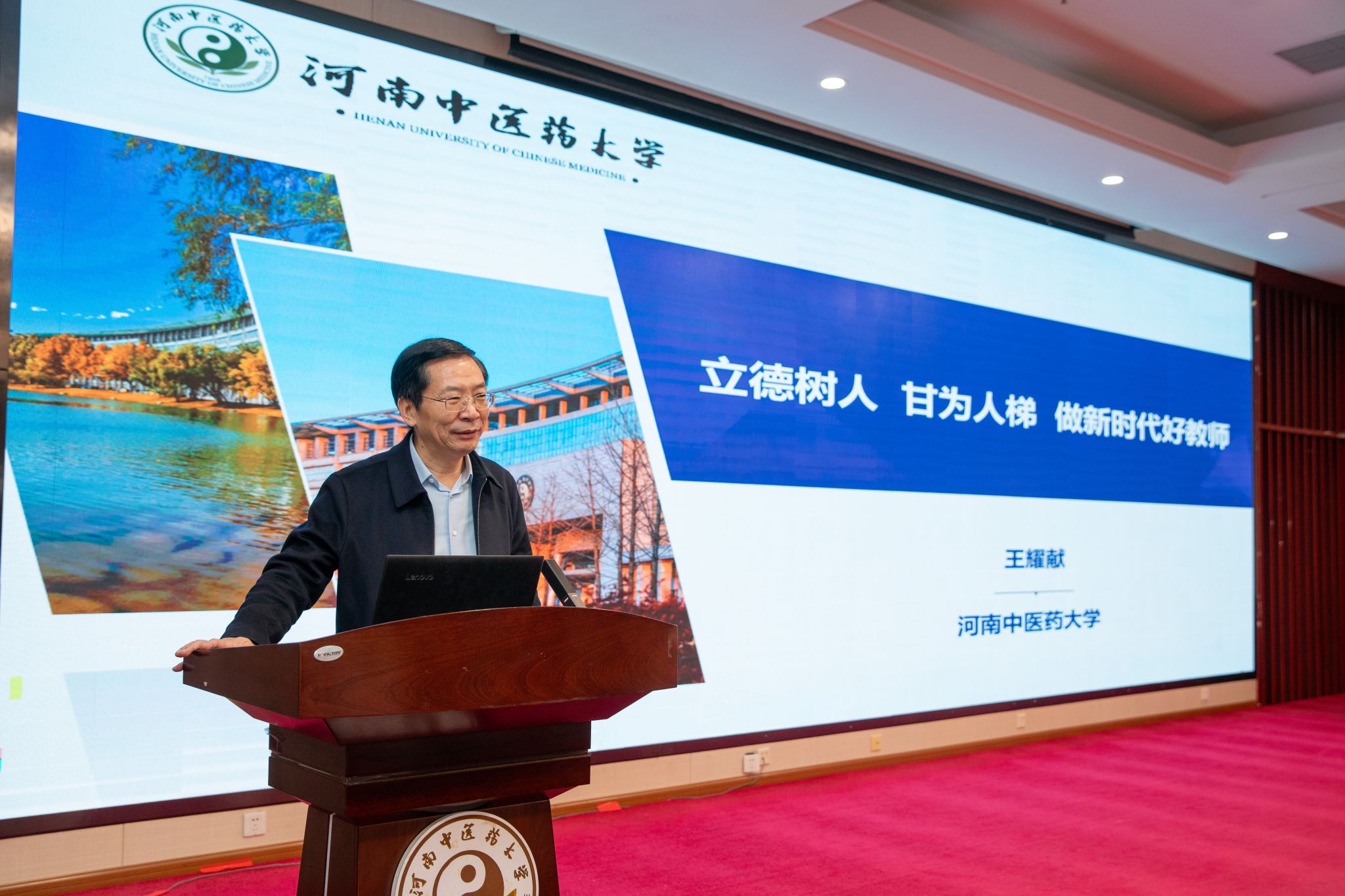 校长王耀献以《立德树人 甘为人梯 做新时代好教师》为题,围绕“高校青年教师的能力与素养、中医药教育的历史方位、中医药高校青年教师的责任与使命”,为全体新教师讲授入职第一课。王耀献指出,高校教师要基于岗位要求不断提升师德素养、教学能力、科研能力,具备创新能力、信息能力及综合素养,涵养良好教风、学风、作风,才能更好服务学生未来发展。王耀献强调,学校广大青年教师要牢记育人初心、扛牢育人使命,坚持立德树人,苦练教书育人本领,提高人才培养质量,以良好的育人成果助力学校“双一流”创建、服务中医药强省建设,在追求个人价值中实现与社会价值的统一。