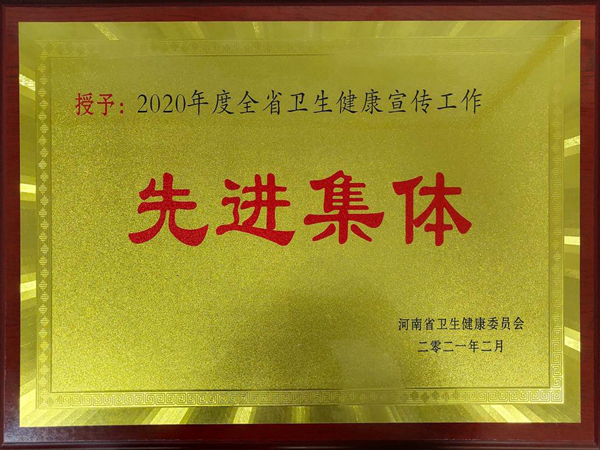 一附院荣获“2020年度全省卫生健康宣传工作先进集体”“‘健康中原行·大医献爱心’卫生志愿服务突出贡献单位”称号。一附院宣传统战部何世桢荣获“2020年度全省卫生健康宣传工作先进个人”,市场开发部李海松、姜永昌分别获得获“2020年度全省健康素养促进行动项目工作先进个人”“‘健康中原行·大医献爱心’卫生志愿服务优秀志愿者”称号,医养结合发展部叶森获“第三届河南省健康科普能力大赛现场表现奖”,儿科张楠楠获“第三届河南省健康科普能力大赛入围奖”。