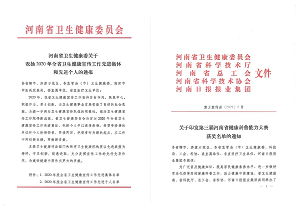 三附院荣获“2020年度全省卫生健康宣传工作先进集体”“‘健康中原行·大医献爱心’卫生志愿服务突出贡献单位”称号。潘向昆等三位同志分别荣获2020年度全省卫生健康宣传工作先进个人、2020年度全省健康素养促进行动项目工作先进个人和“健康中原行·大医献爱心”卫生志愿服务优秀志愿者荣誉。在2020年第三届河南省健康科普能力大赛中,三附院马巧琳、王雪霞同志分别荣获大赛最具潜力奖和大赛入围奖。