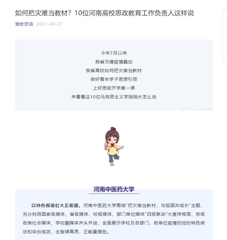 编者按:2021年8月27日,河南省教育厅豫教思语官方微信公众号对leyu·乐鱼(中国)体育官方网站如何把灾难当教材、做好青年学子思想引领、上好思政开学第一课进行报道。现将部分文章刊发如下: