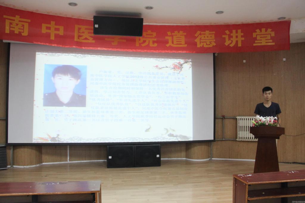 本次“道德讲堂”活动以“身边人讲身边事,身边人讲自己事,身边事教身边人”为主要形式,共有七个环节,分别是做自省三问、唱道德歌曲、学身边模范、颂道德经典、谈行善体会以及送吉祥、写祝福。活动开始,主持人针对当前大学生存在的一些不良行为向同学们提出三个问题,带领大家自省自问,深思自己是否做出了正确的价值选择和行为选择。紧接着,在激情四溢的曲调中现场同学共唱起励志歌曲《我相信》,期望同学们不仅仅在学习、事业上有自信,更应相信自己在道德上有自信。随后进行“十佳团员”评选活动,由每位候补团员进行竞选演讲,评委老师根据演讲及日常表现进行评分,评选出十位优秀团员。人文学院户振亚讲述了自己在生活上自立自强、百折不挠以及日常与同学之间互帮互助、相互尊重的故事,感人肺腑的话,使全场同学自发为之鼓掌,也使同学们看到一个顽强拼搏、不畏艰险的勇者形象。药学院李静婉则讲述了自己在贫困处境逆流而上、不肯屈服的故事,他刻苦钻研、埋头奋进的精神,打动了在场的每一位听众。最终,经过激烈的角逐,第一临床医学院何文昭、第二临床医学院谢倩楠、药学院李静婉、三附院郭承、研究生扶伟、基础医药学院张志恒、外语学院王杨、人文学院户振亚、信息技术学院冀红宁、针灸推拿学院马超等十位同学荣获2014年度“十佳团员”称号。模范事迹报告结束后,在主持人的热情邀请下,众多同学上台向在场的师生分享了自己身边的好人好事以及自己对参与《道德讲堂》的感想。在朗诵经典环节中,全场师生共同诵读经典,期望能从古人的严格自律中学到更多优良品德。活动结束之际,参加活动的老师和同学们还互送吉祥卡、写祝福语,现场氛围温馨和谐。