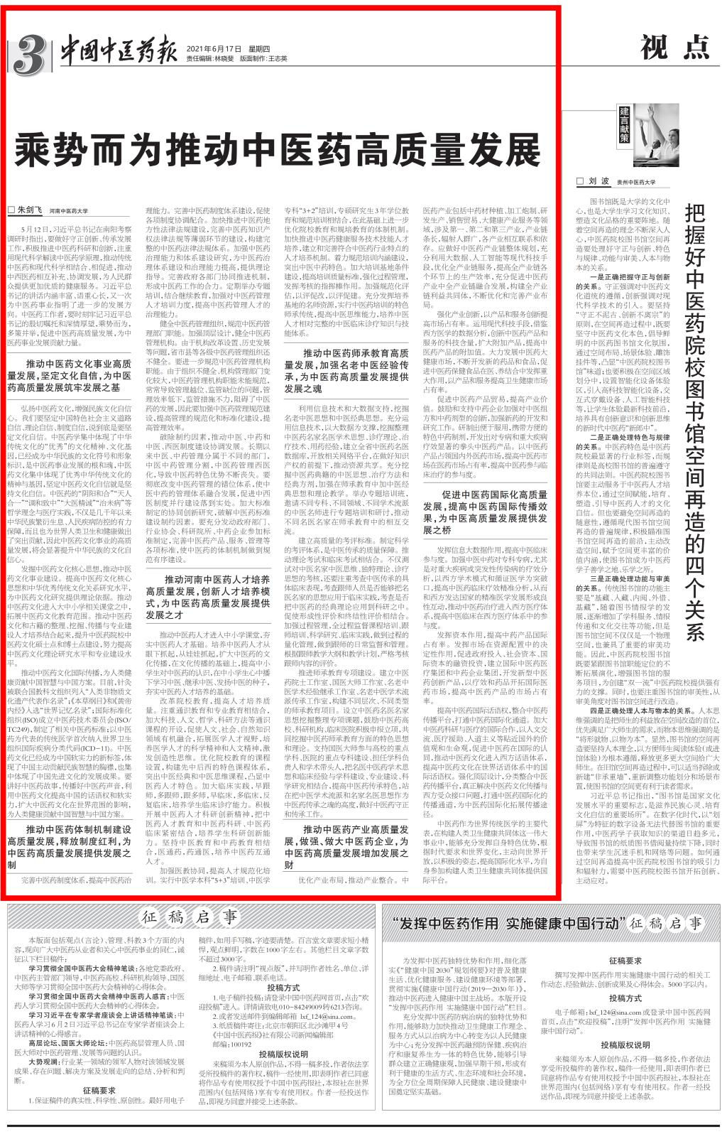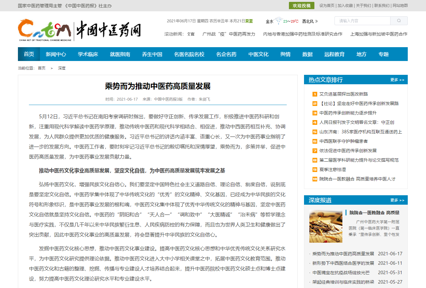 编者按:2021年6月17日,中国中医药报、中国中医药网对leyu·乐鱼(中国)体育官方网站国际教育学院副院长朱剑飞教授的理论文章《乘势而为推动中医药高质量发展》进行报道。现将全文刊发如下: