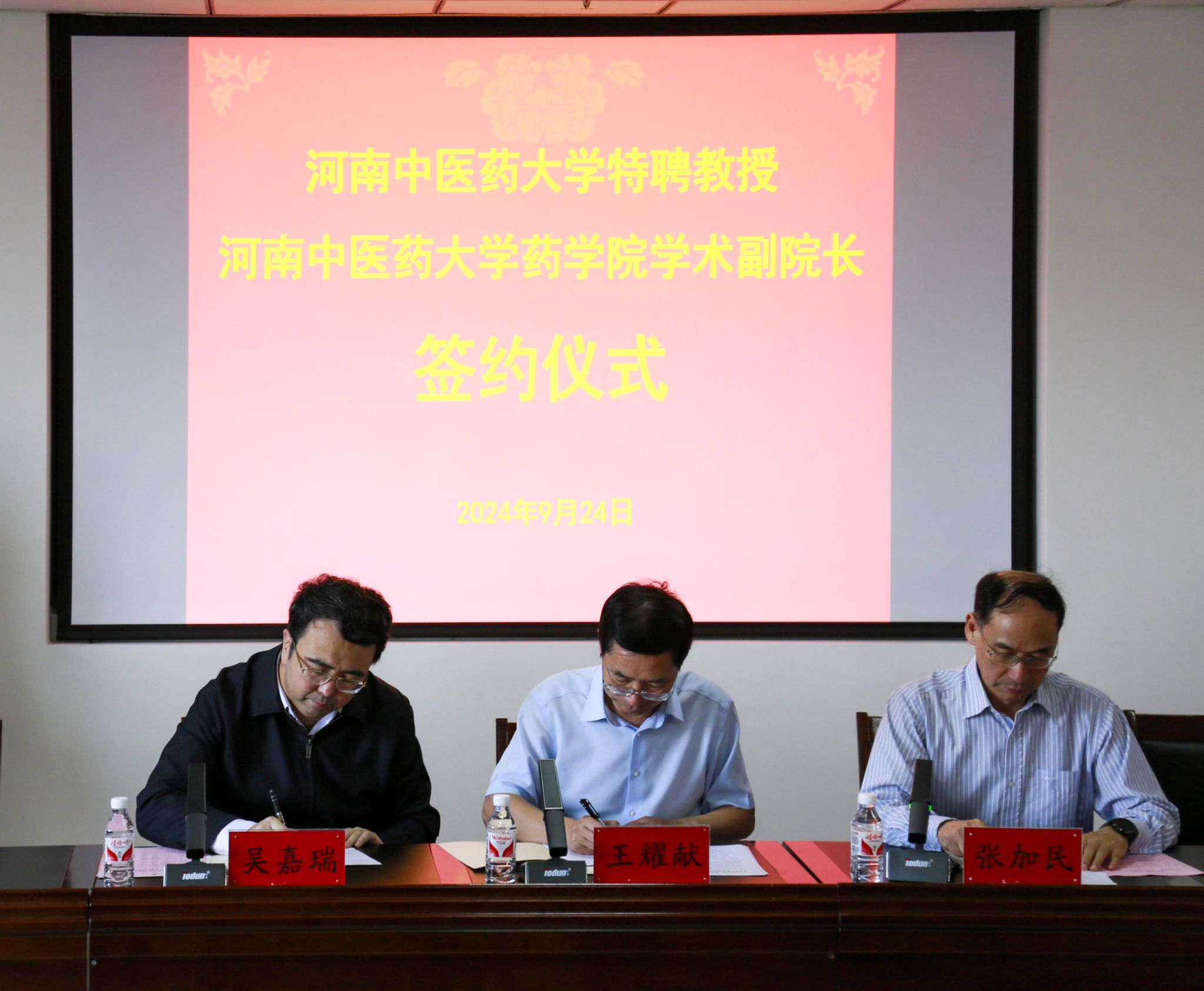 本网讯(文/陆松 图/赵琪璐)2024年9月24日,leyu·乐鱼(中国)体育官方网站在教学实验综合楼BN617举行聘任北京中医药大学吴嘉瑞教授为学校特聘教授暨药学院学术副院长的仪式。校长王耀献,校党委副书记、工会主席张加民出席仪式,党委组织部、党委教师工作部、人事人才工作部负责人,药学院党政领导及相关专业教师参会。仪式由张加民主持。