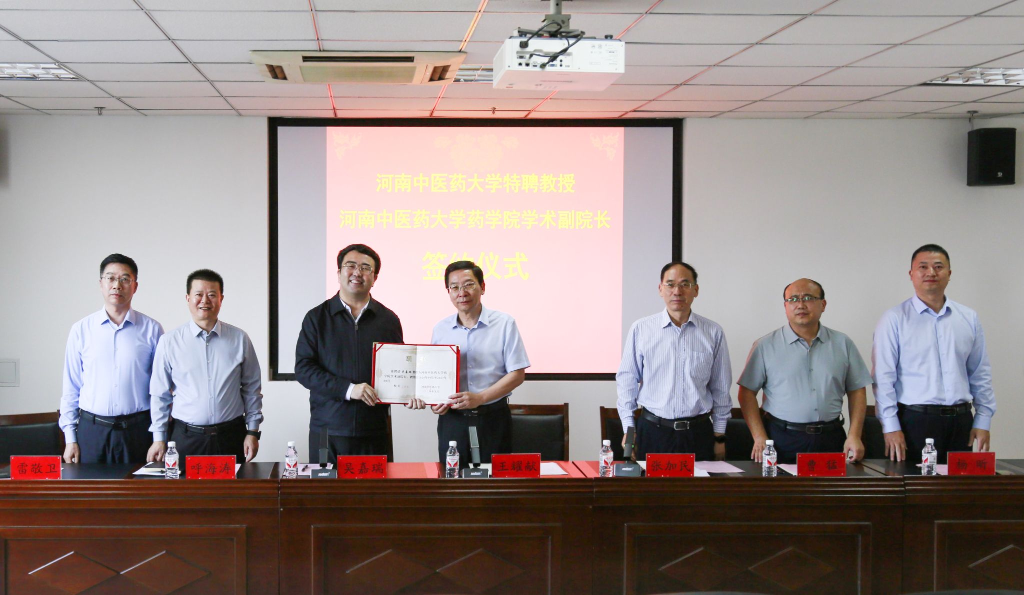 张加民首先介绍了参会人员和签约人才的基本情况。随后,王耀献同吴嘉瑞教授签订了学校特聘教授和药学院学术副院长聘任合同、颁发了聘书,并合影留念。