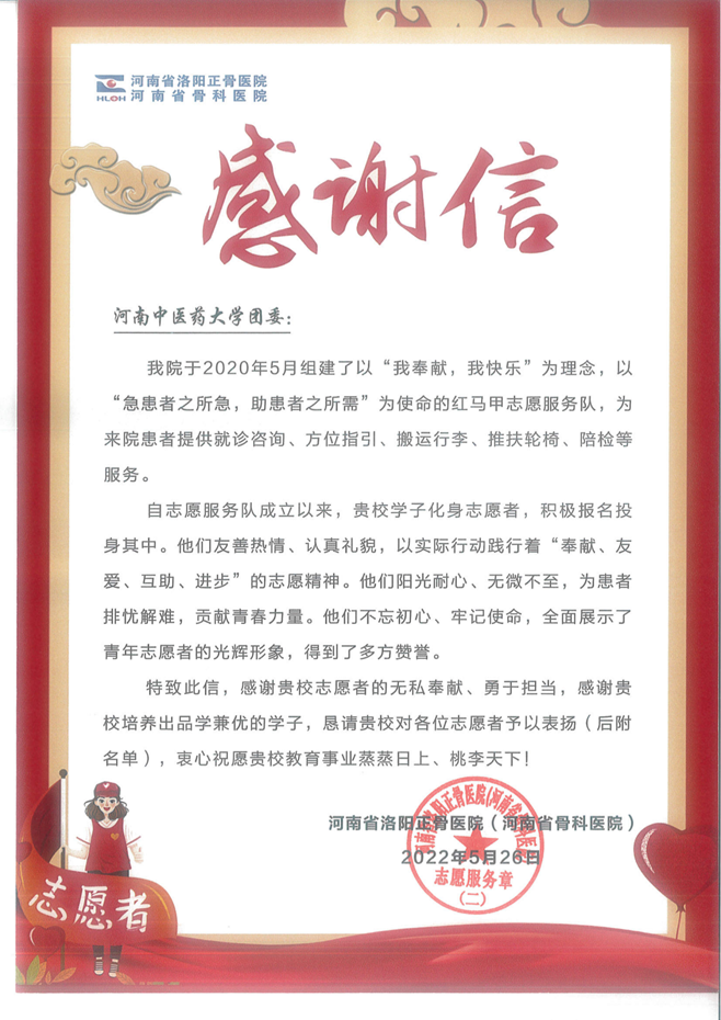 本网讯(文/图 郭薇)近日,校团委收到一封来自河南省洛阳正骨医院的感谢信,向leyu·乐鱼(中国)体育官方网站积极报名参加医院志愿服务的曹亚宁、陈继聪、陈璐瑶等84名同学表示感谢。